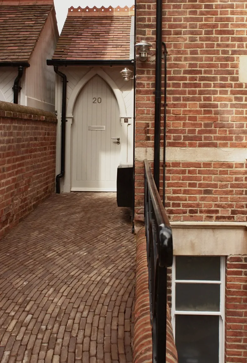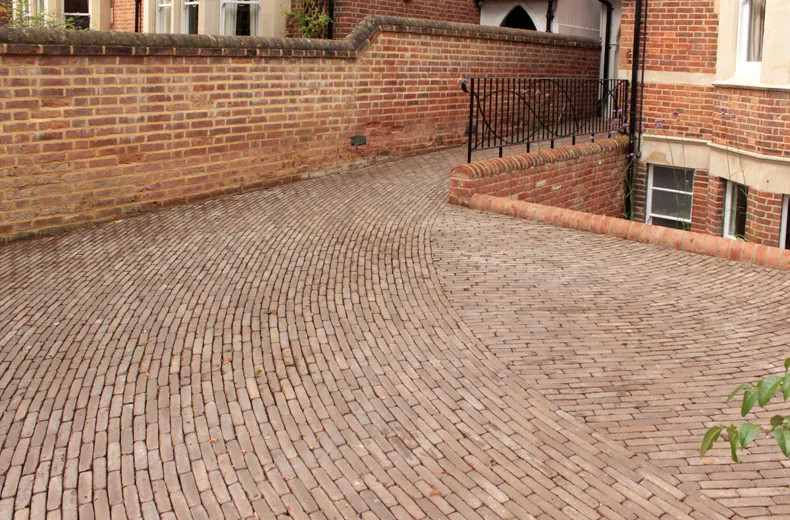 To continue the subtle flow and harmony from the arched door surround and unique iron railing feature, small element clay paving laid in a curving design completed Charlotte's underlying curve-linear design by using Vande Moortel's Ancienne Belgique Camel clay paver, the 185 x 45 x 90mm format size allowing the radial design to be achievable in smaller areas.