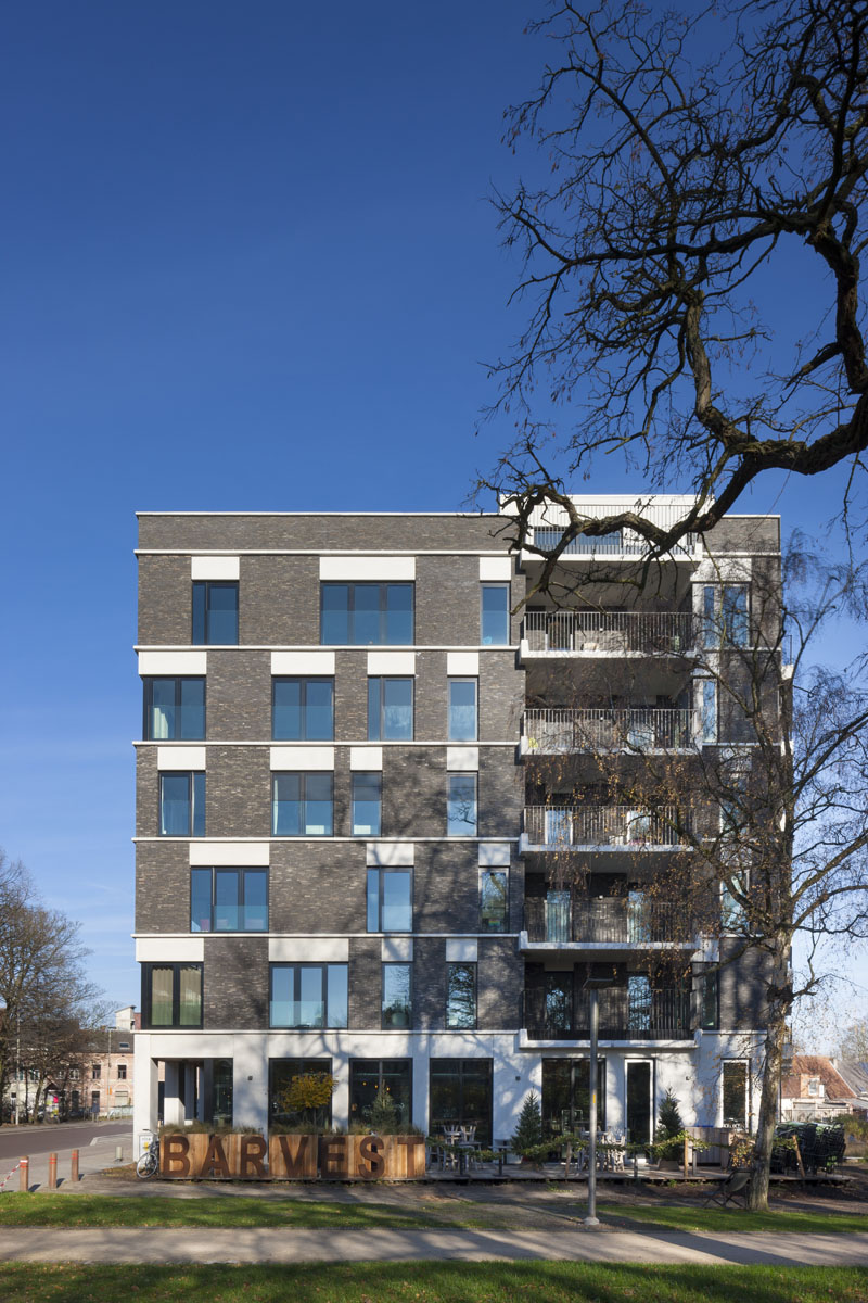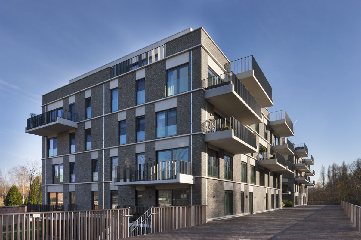 They are interconnected by a wide footpath created using anthracite-coloured clay pavers from Vande Moortel, with a spacious underground car park underneath. The outside space has been interpreted as a park, ensuring that the project blends in seamlessly with the surrounding ramparts.