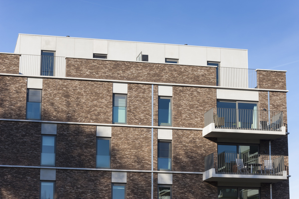 Via a meticulous choice of materials and a number of visual variations in shade, each volume has been given its own unique identity that makes the most of its exact location at the site. The gatehouse in front responds to the more urban context. It serves as a landmark with its public-oriented base, seven floors, internal terraces and the black-grey shade of the brickwork.