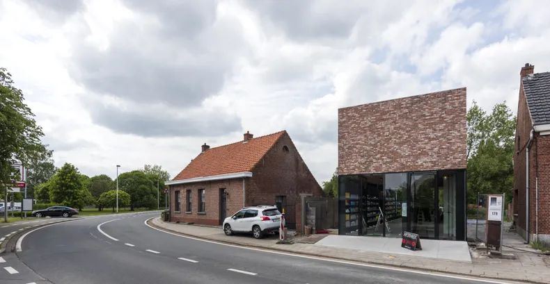 To ensure the architectural balance of the building and to respect its context, the choice was made to place a brick upper level on the glass base.The brick upper floor houses one of the country's largest pharmacy robots. It's high-tech of the highest level with a typical Flemish wrapping.