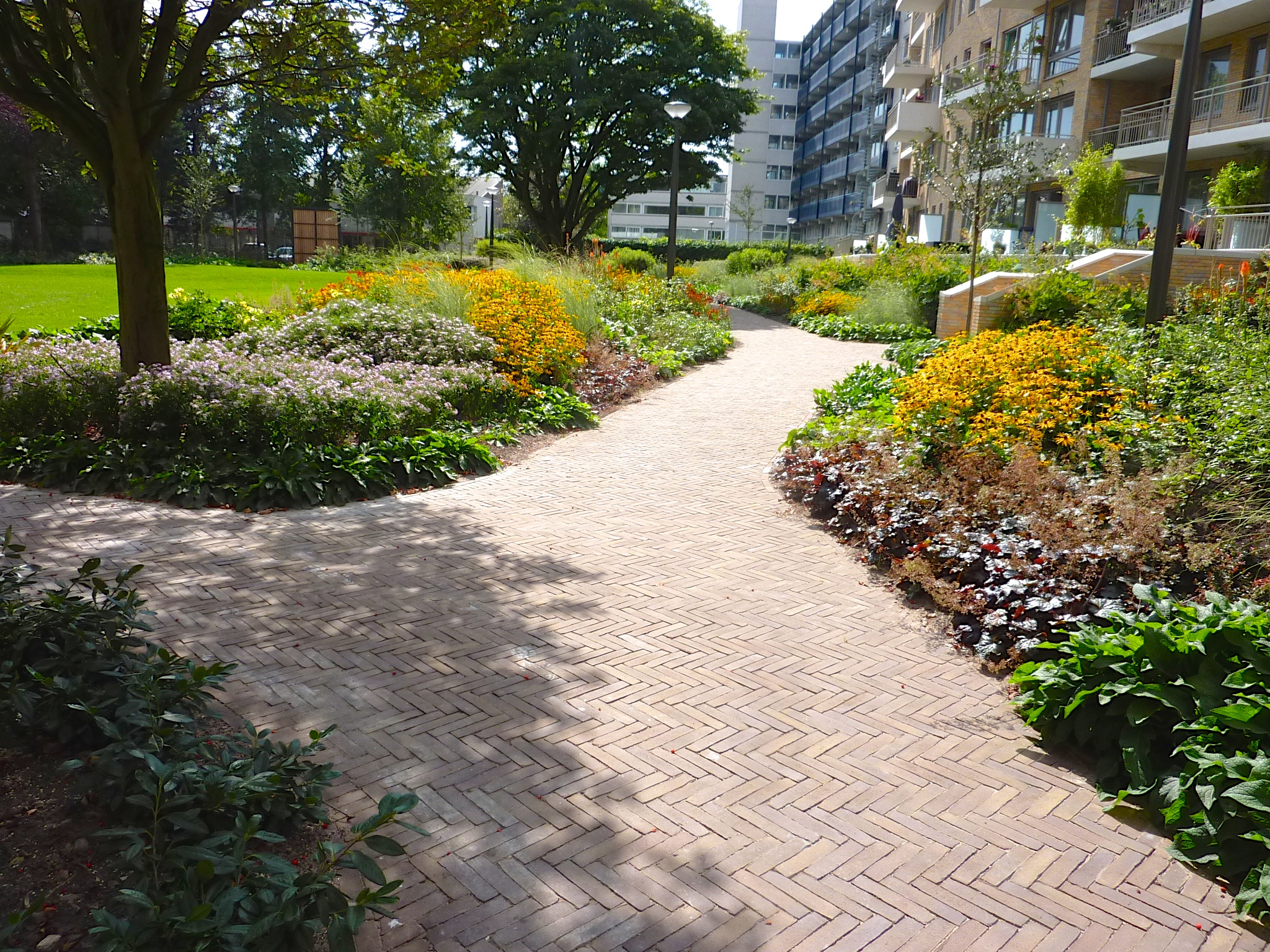 The pavers are laid on edge, always with the sanded side laid against the non-sanded side. Drummed clay pavers are to be laid with the least damaged stretcher side facing upwards.