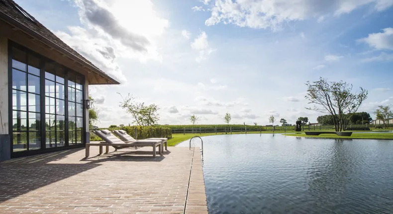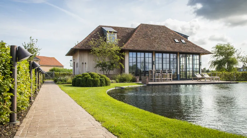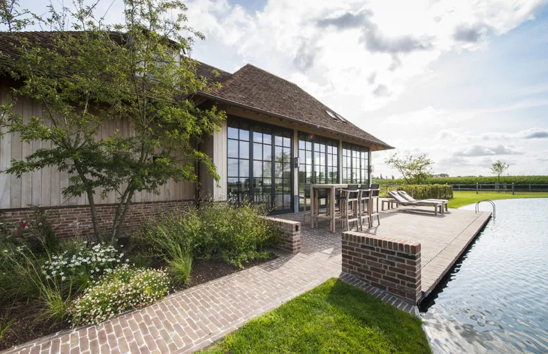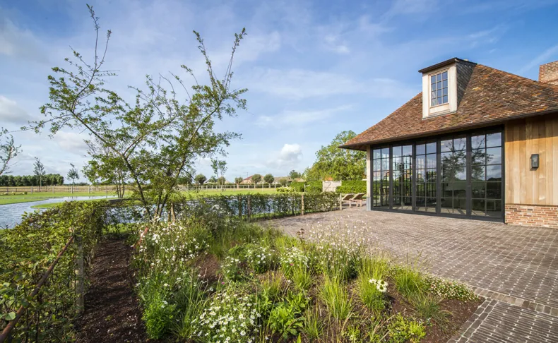 The client, Koen, lives very near to his business at the French border. He longed for a place where he could unwind, with no connections whatsoever to his hatchery business. Landscape architect Berwout Dochy's mission was to design a garden based on this brief. In addition, the garden had to blend seamlessly with the surrounding landscape and accommodate a large pond intended for firefighting.