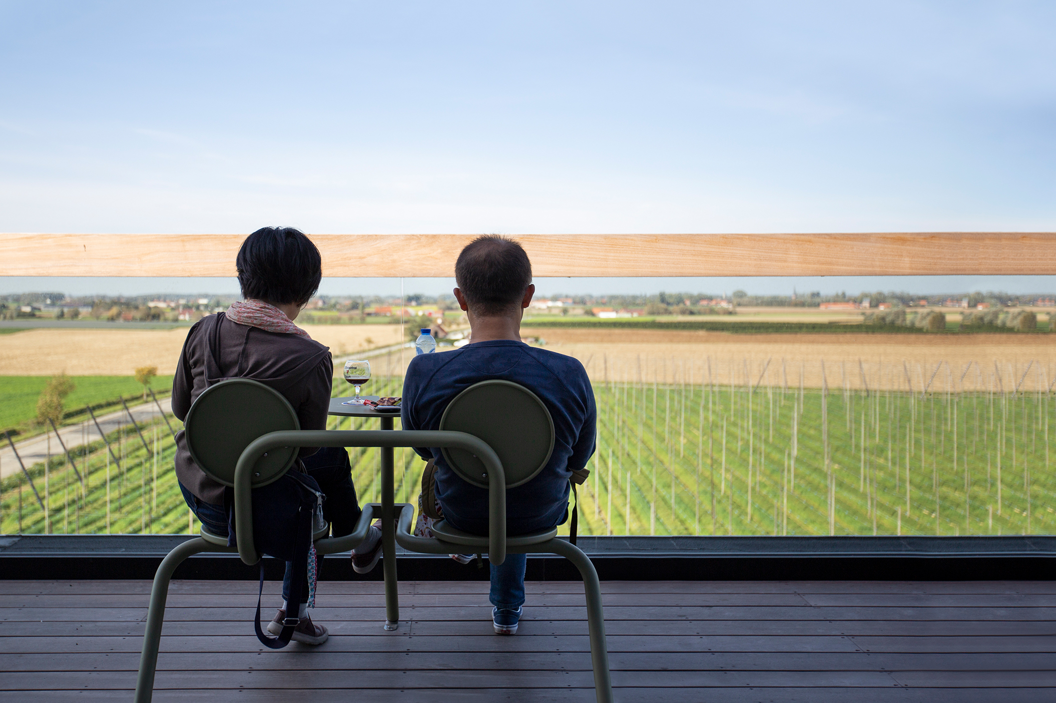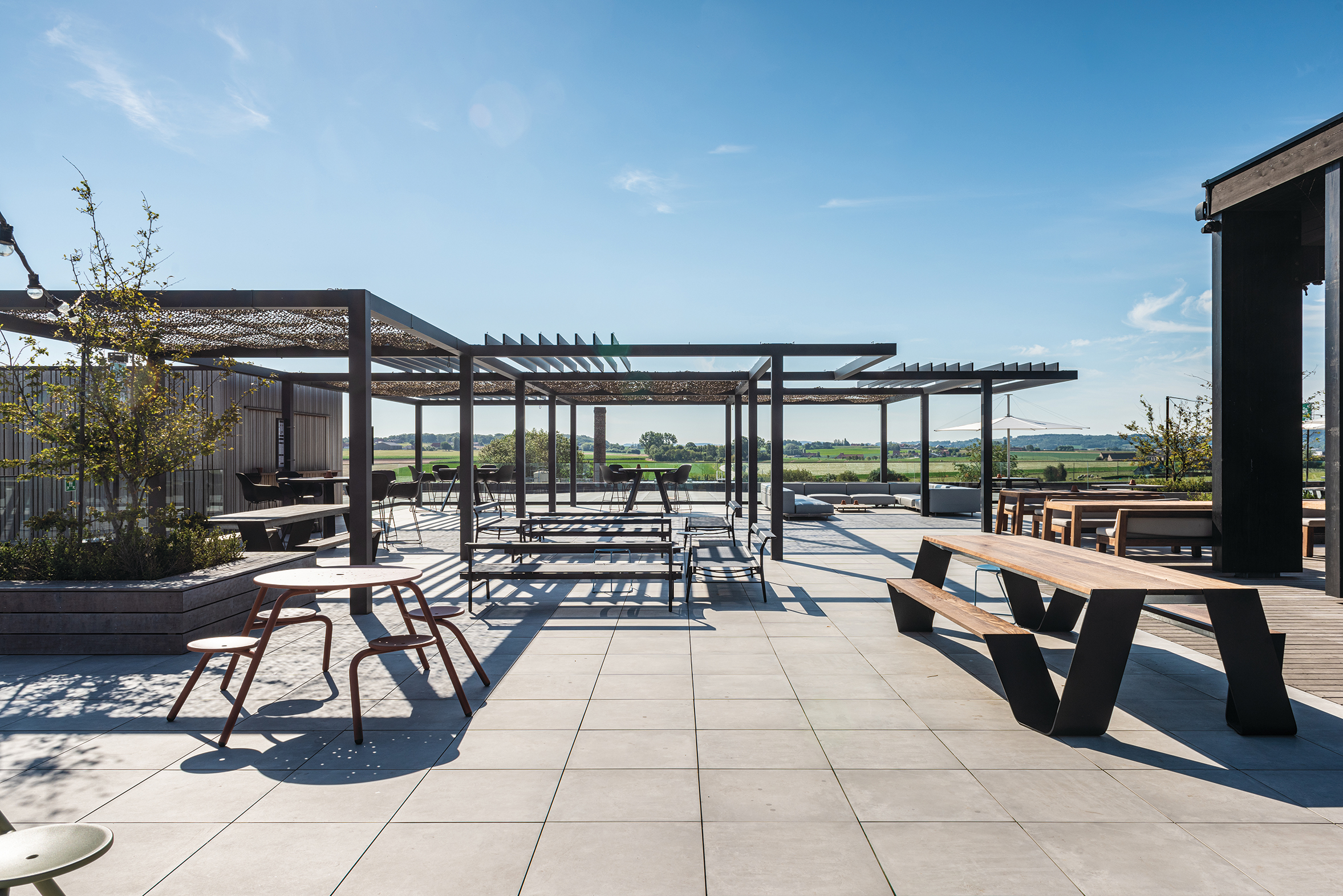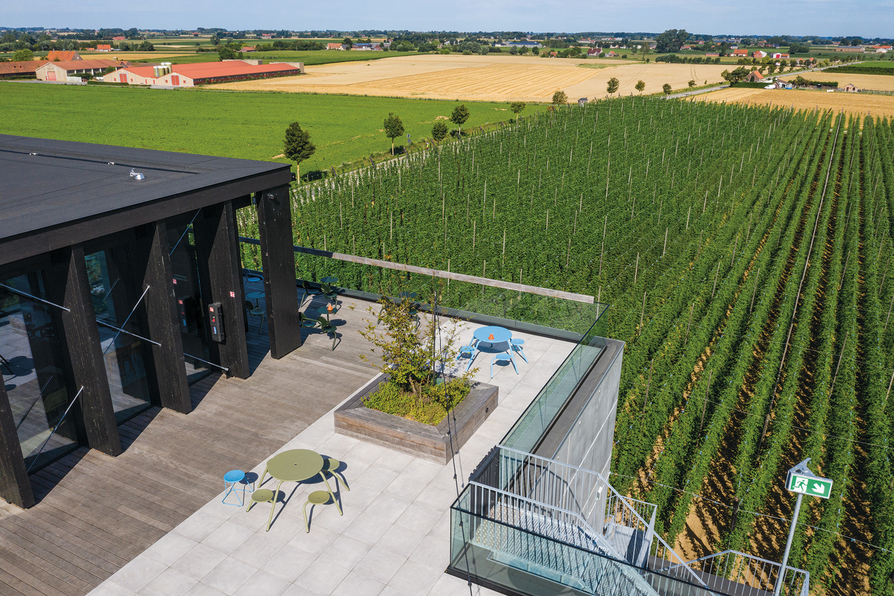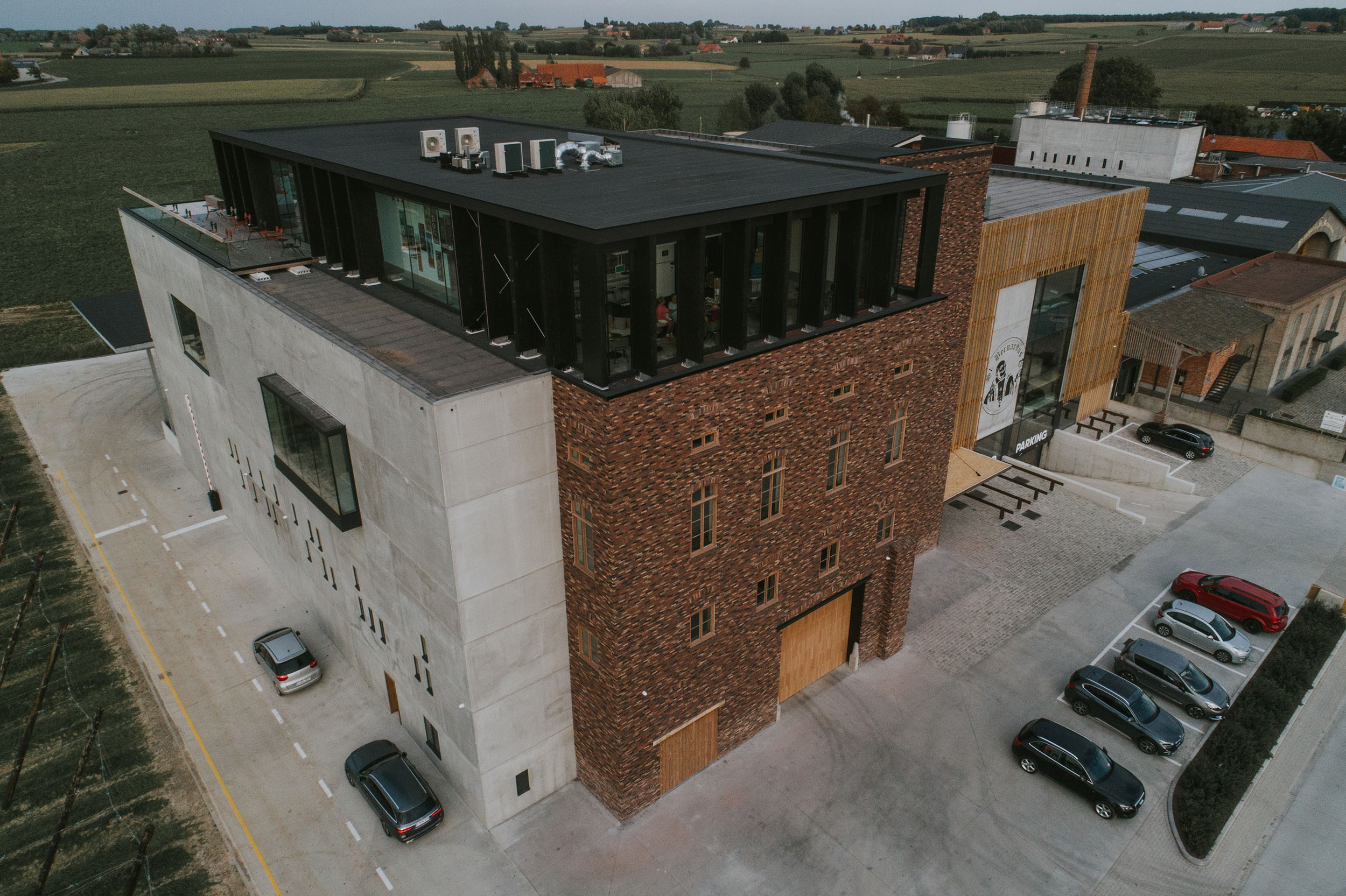 The solid structures form the basis for the strong vision and unconditional belief in the future of the brewery. The realisation of a roof in a contemporary style, on top of a classically designed base building, symbolises the future of the Sint-Bernardus beer along with the craft and art of brewing. The materialisation of this vision for the future has been clearly developed in the ‘Bar Bernard’ rooftop bar where you can enjoy a 360° panoramic view over the hop fields.”