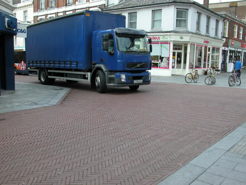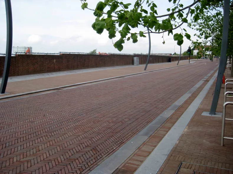In order to reduce the speed of the traffic, they removed the road signs and road markings and made the road narrower. In order to make it narrower, different materials were used instead of concrete, including DecimA Amarant clay pavers. These changes ensure that motorists are more alert and have an increased awareness of what is going on around them.