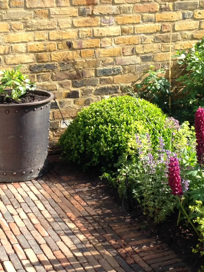 "A rich palette of materials consisting of Vande Moortel clay paving, Bingley Sandstone from Yorkshire, traditional weathered London Stock bricks and Bronzino bronze cauldrons brought a sophisticated and elegant feel to this private garden in Ravenscourt Park, London W12.