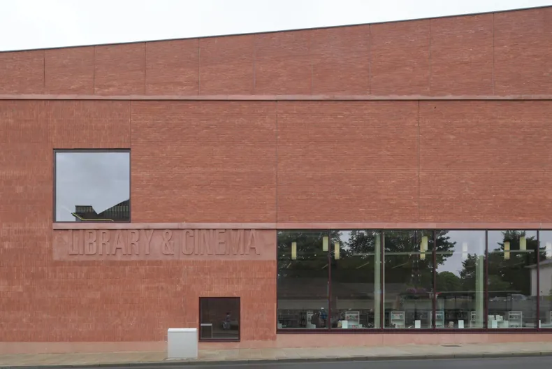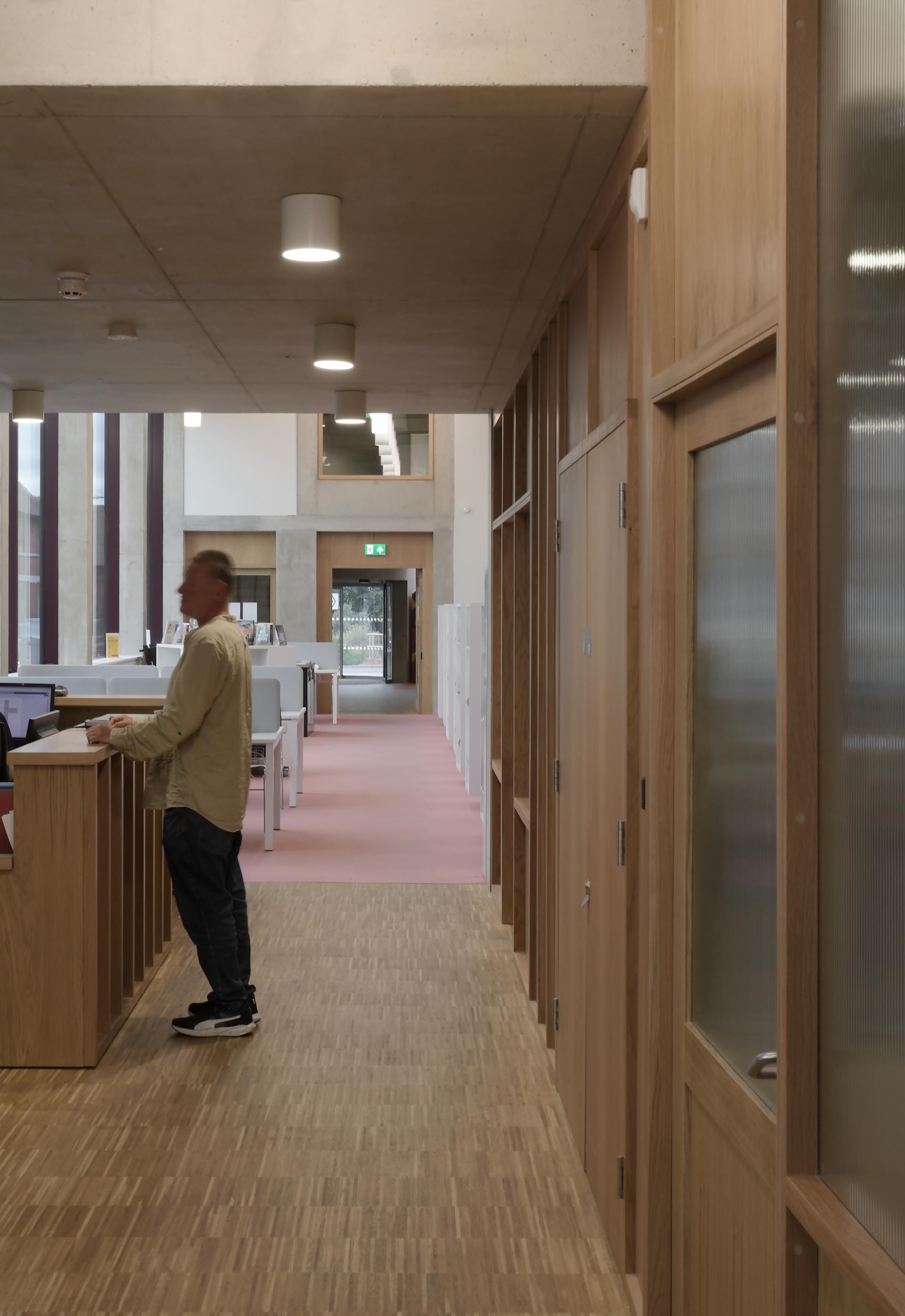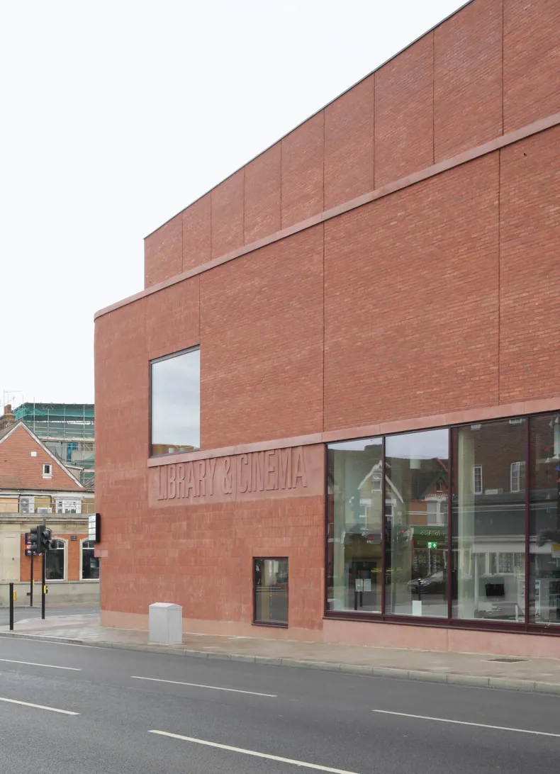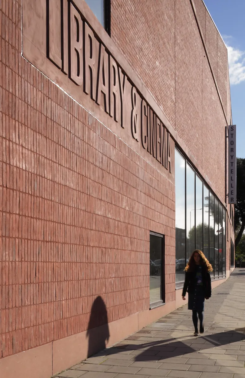 At street level, the building is designed to invite public engagement. The café and library open directly onto the pavement through generous glazed openings, while a recessed entrance within a cylindrical drum gives the building a recognisable civic presence. A glazed, tower-like gable facing the high street echoes the cinematic heritage of the area, referencing the art deco cinema that once stood opposite.