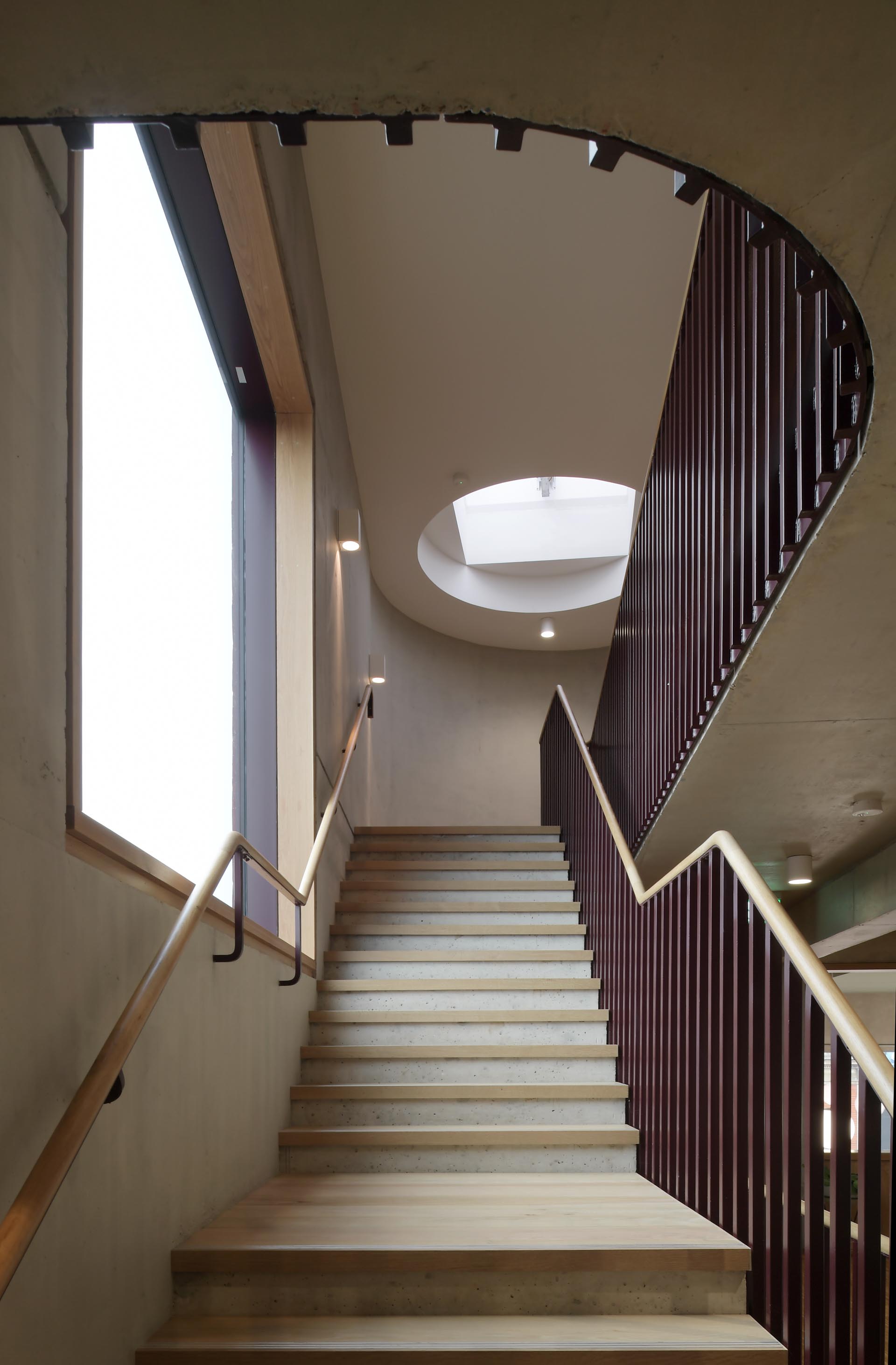 Internally, the spatial configuration reflects the complexity of the programme. The ground floor comprises a sequence of double-height public spaces defined by an expressive concrete frame, while timber-lined anterooms provide circulation and support spaces. The vertical circulation core, marked by a central stair, resolves the plan’s geometry and acts as the primary point of orientation. These interior arrangements are both sculptural and functional, contributing to the building’s civic identity.