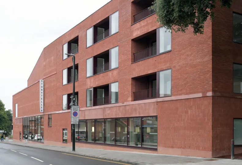 Occupying a highly constrained plot—just 11 metres wide and 68 metres long—Sidcup Storyteller acts as a hinge at a key crossroads within the town centre. Its carefully resolved massing and nuanced geometry address the urban setting with sensitivity and clarity. The building combines a ground-floor library and café with co-working spaces, a suite of three cinema screens, and community facilities on the upper levels. Above, nine residential apartments provide cross-funding for the civic functions, while their presence contributes to the building’s urban continuity.