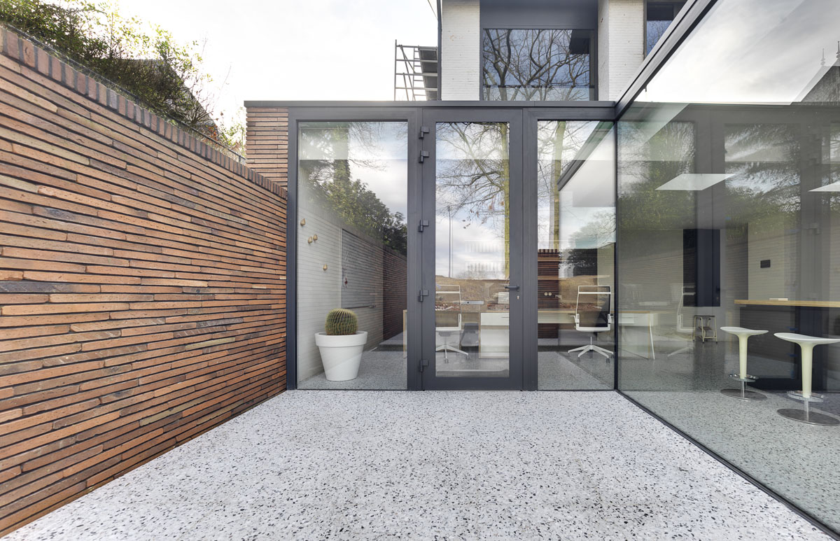 The building remains unchanged by the addition of a lower patio with a separate entrance at the front. The patio also ensures sufficient light comes in and it creates a sense of space, resulting in a pleasant workspace.