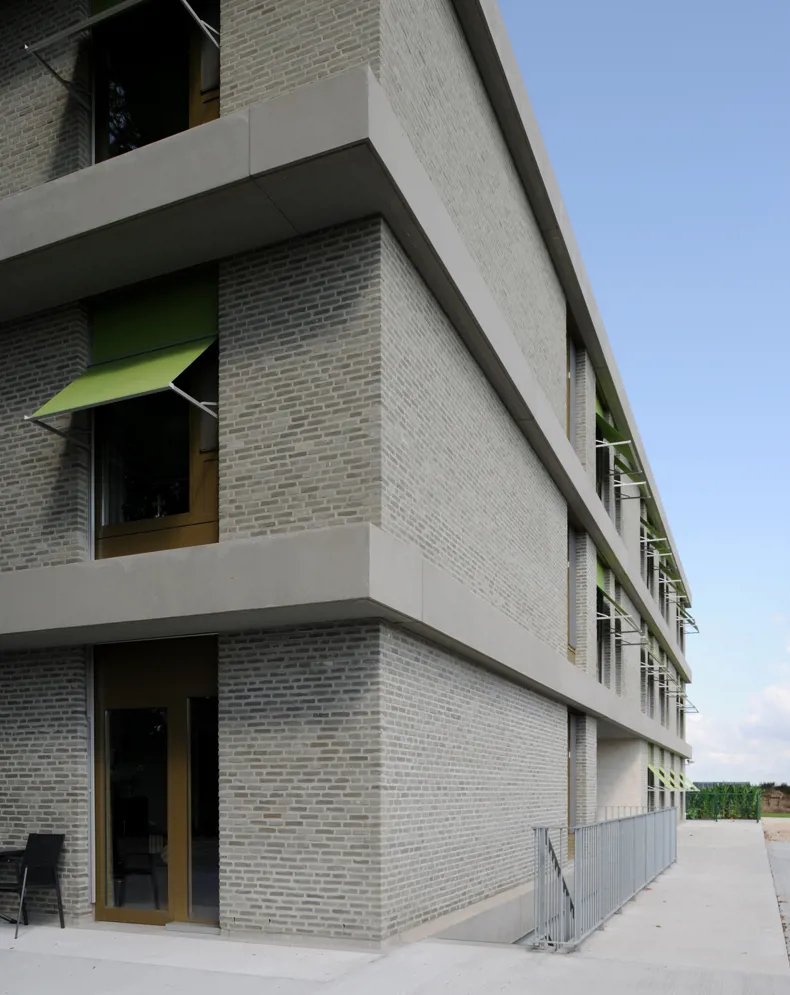 To emphasize this aspect even more Sergison Bates architects chose to source the brickworks Locally at our factory. Continuing this taught the Minature green-grey brick is coursed in a ‘broken bond’ pattern following a Flemish tradition.