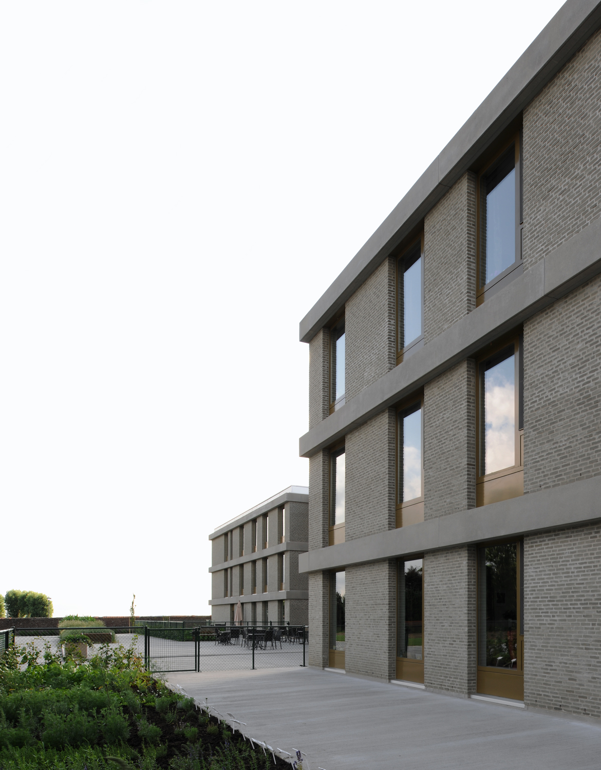 Huise is a rural village set in an agricultural landscape, identifiable from a distance on a bank of high ground marked by tree-lined borders. The care home seeks to engage with this environment, the neoclassical architecture of the main building on the site and the brick wall that marks the boundary.
