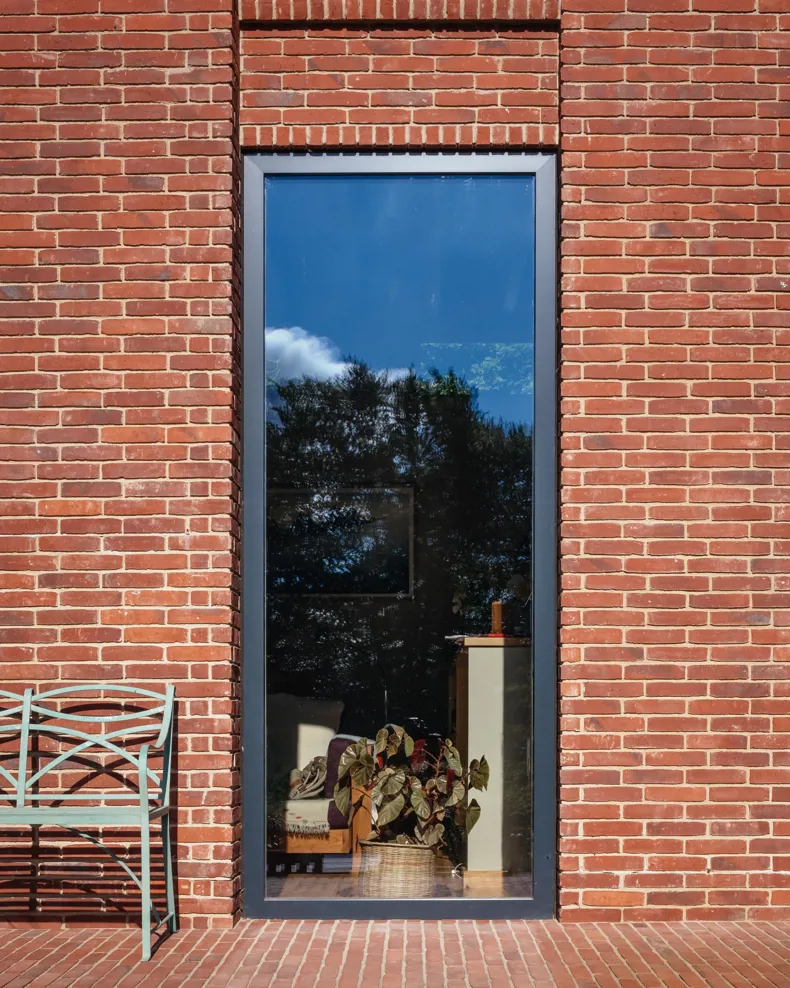 The Gardener’s Cottage has a natural yet industrial, hand-crafted feel thanks to its exposed ceiling beams, red Vande Moortel bricks and clerestory windows, enhancing light and ventilation. The principal material is the red brick, selected after testing 50 types to match the traditional local village architecture. The slim elongated shape provides a modern twist next to the traditional brick construction of the manor house next door.