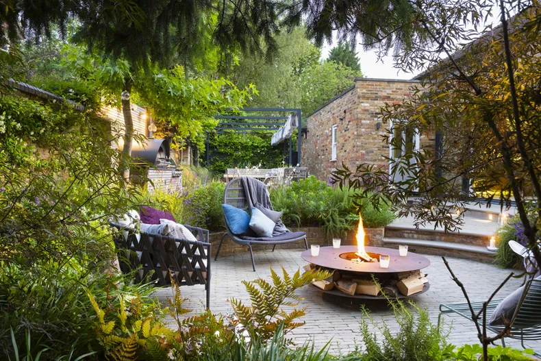 The most important element of the design for us was how to integrate the beautiful light kitchen extension space into the garden. Levelling the two areas was not an option and we were working over three levels to create the fire pit area so a deep feature step in contemporary sandstone was added as you step out of the kitchen. Incorporating the existing garden features and trees was key part of material and plant selection however a few specimens that were in the wrong place or out of character were removed.