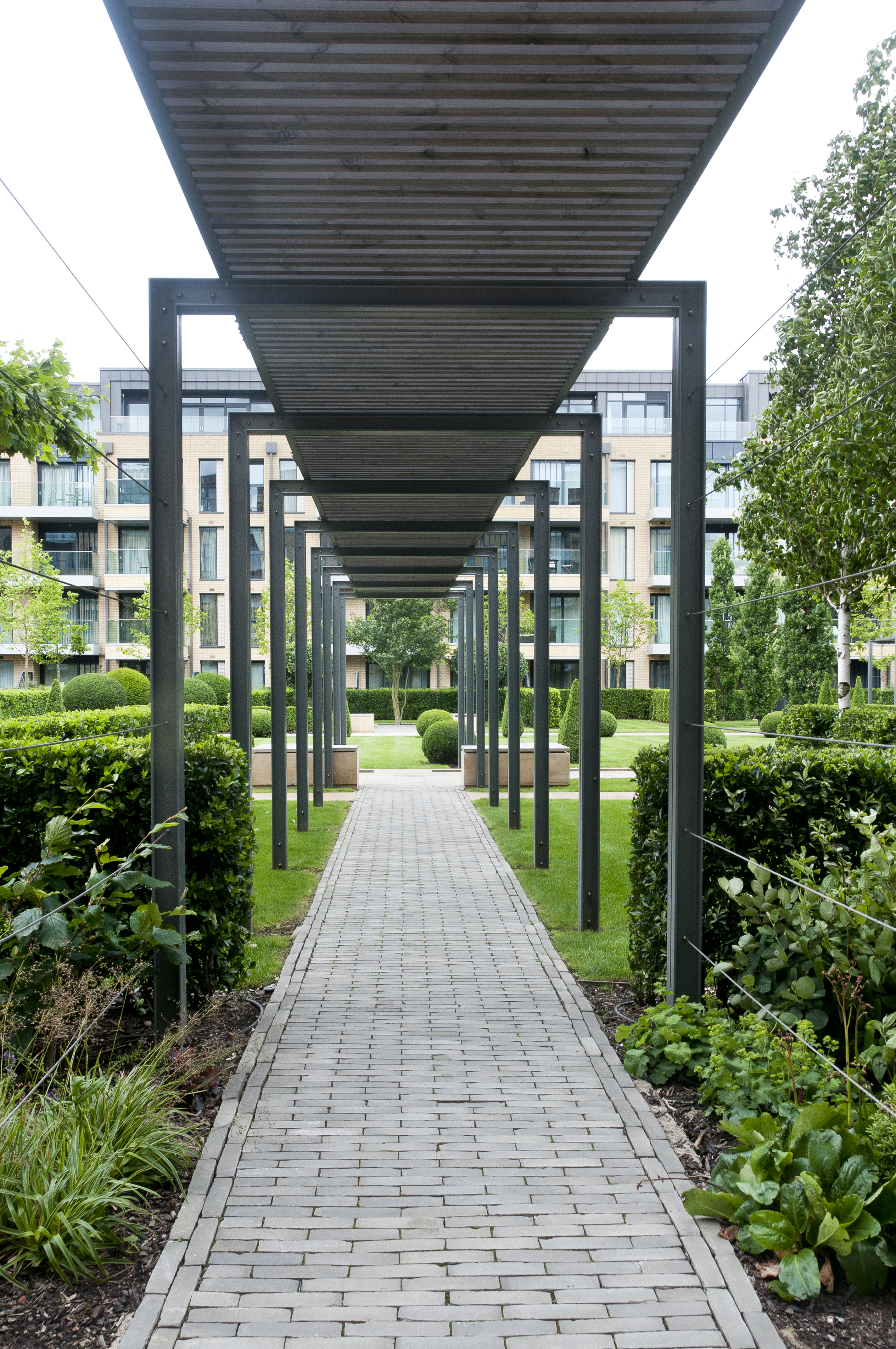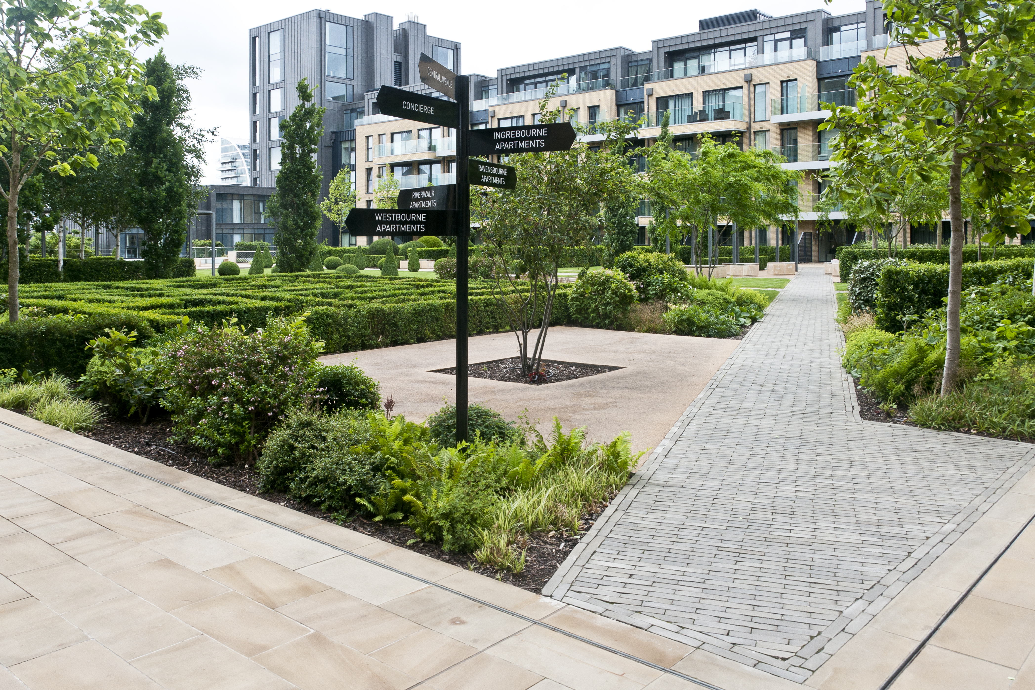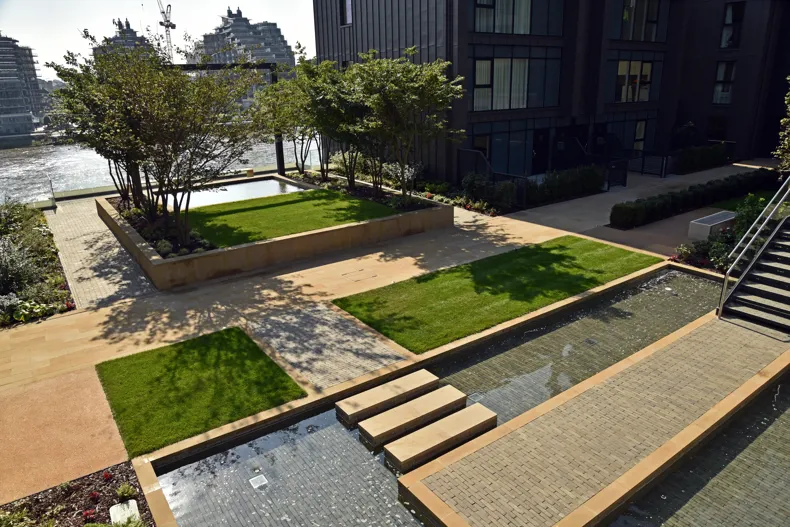 The multi-award-winning gardens at the centre of the development provide residents with a tranquil retreat where they can sit and relax. The concept is based on a series of various interlinked gardens on different levels, leading down towards the Thames.