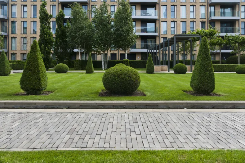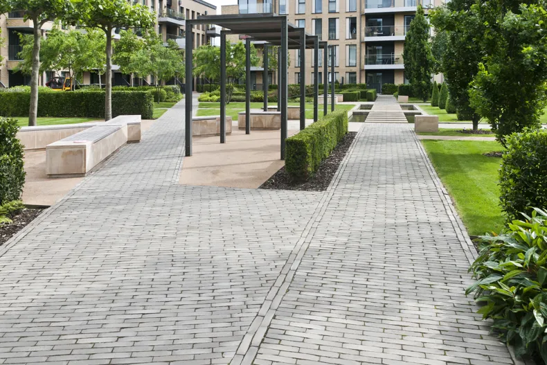 Natural materials – such as the Septima Salvia and Vanilla clay pavers – and wooden furniture create a strong and dynamic ground pattern that is complemented by the blocks of decorative planting and hedges, creating spaces with individual character within the overall composition.