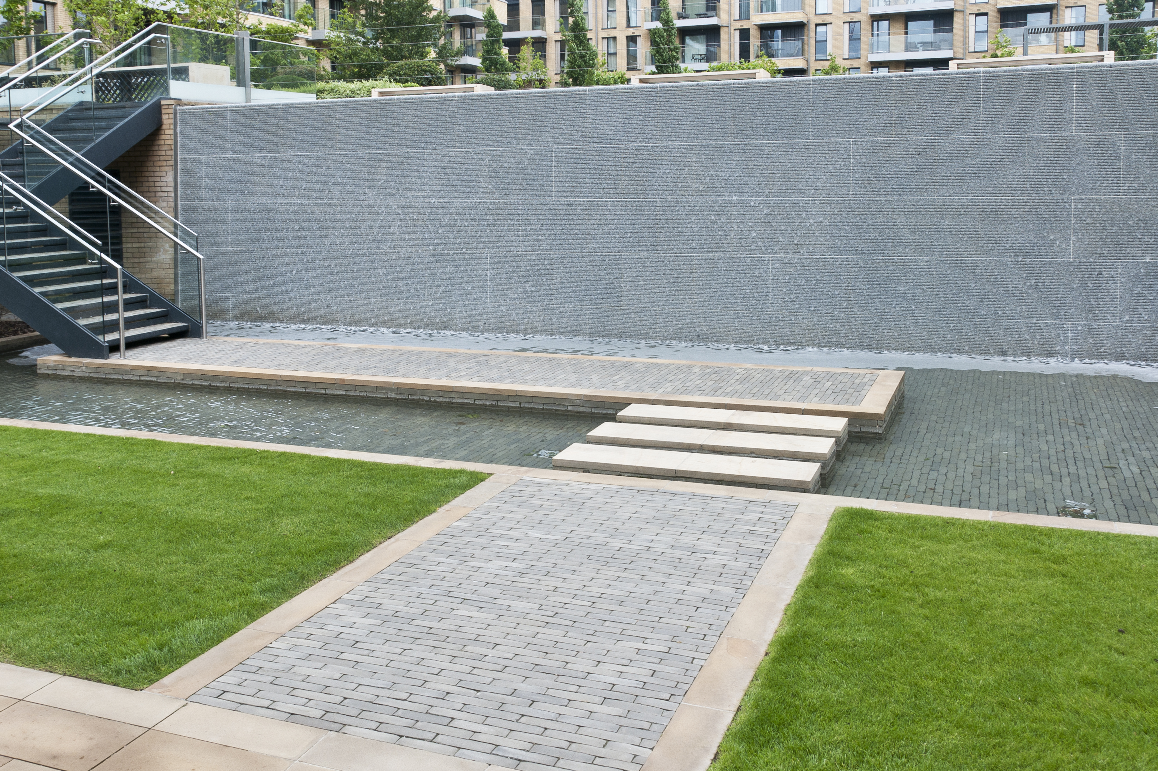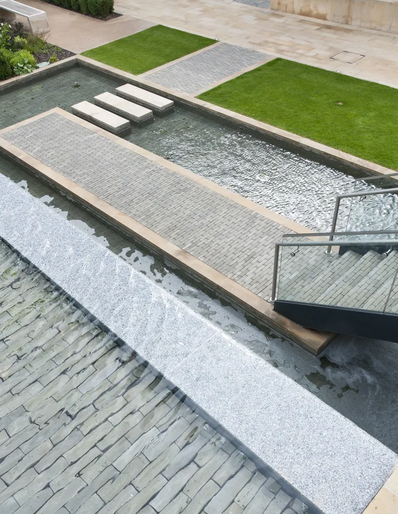 Providing a connection between the clay pavers and the surrounding paths was an extremely important criterion when designing the water features. The texture also provides visual interest and emphasises the movement of the water.