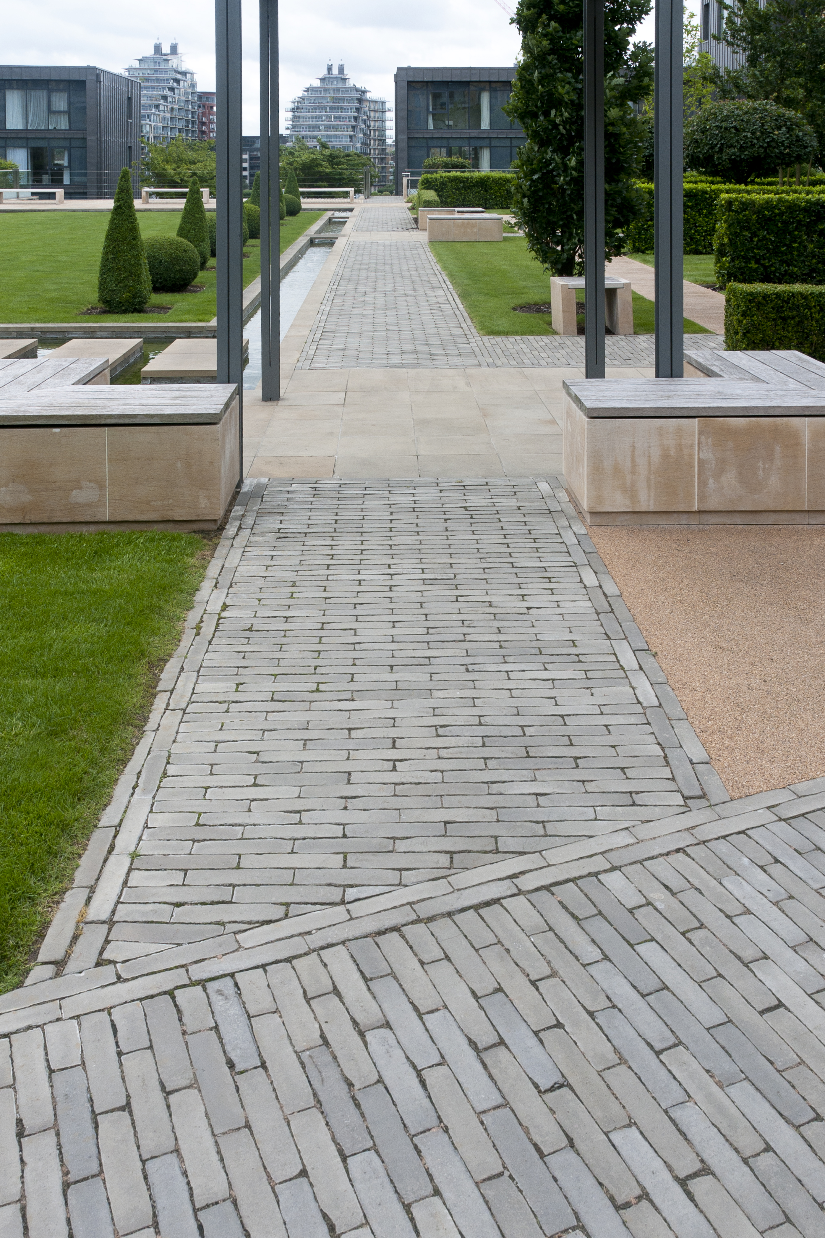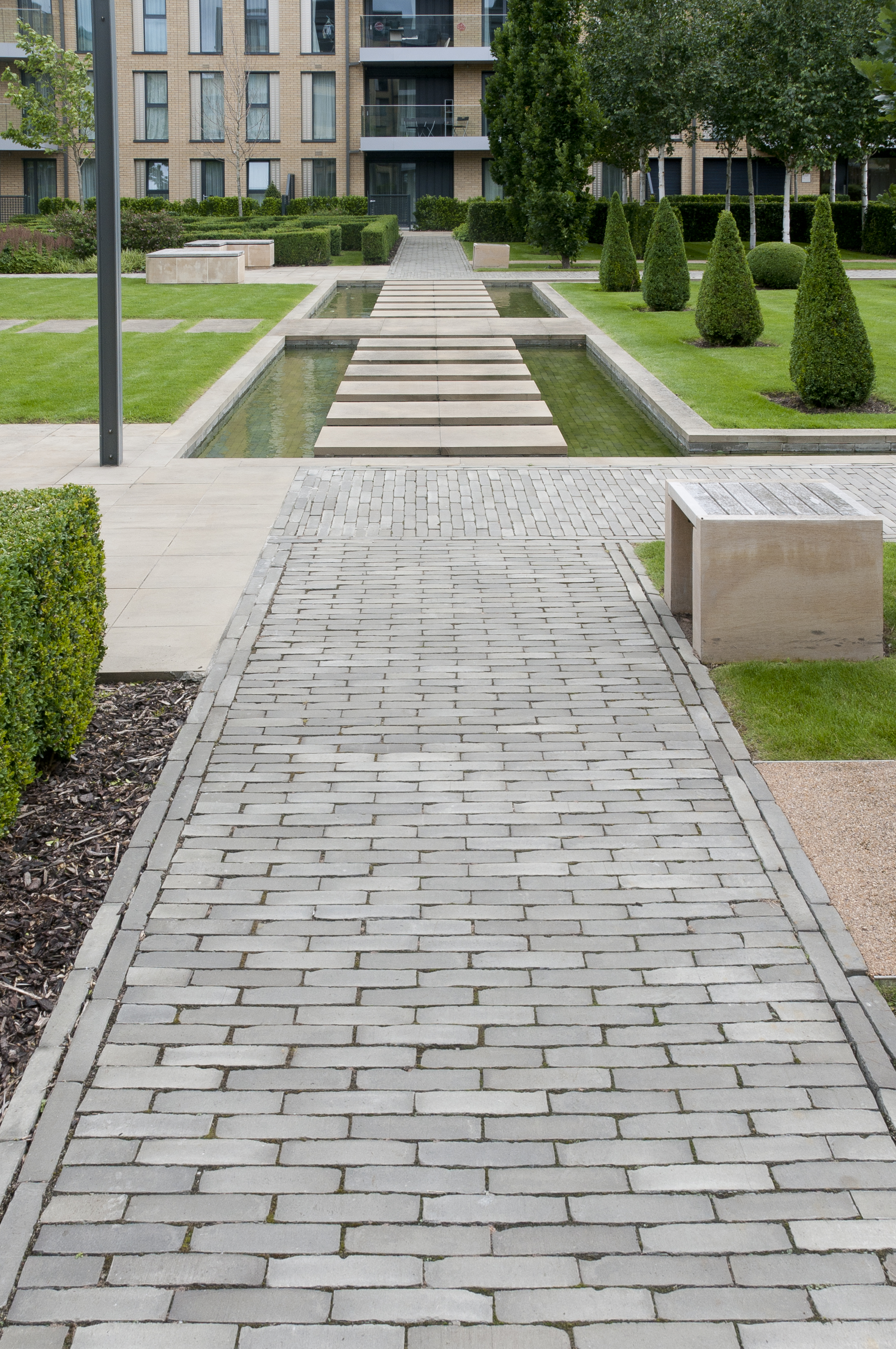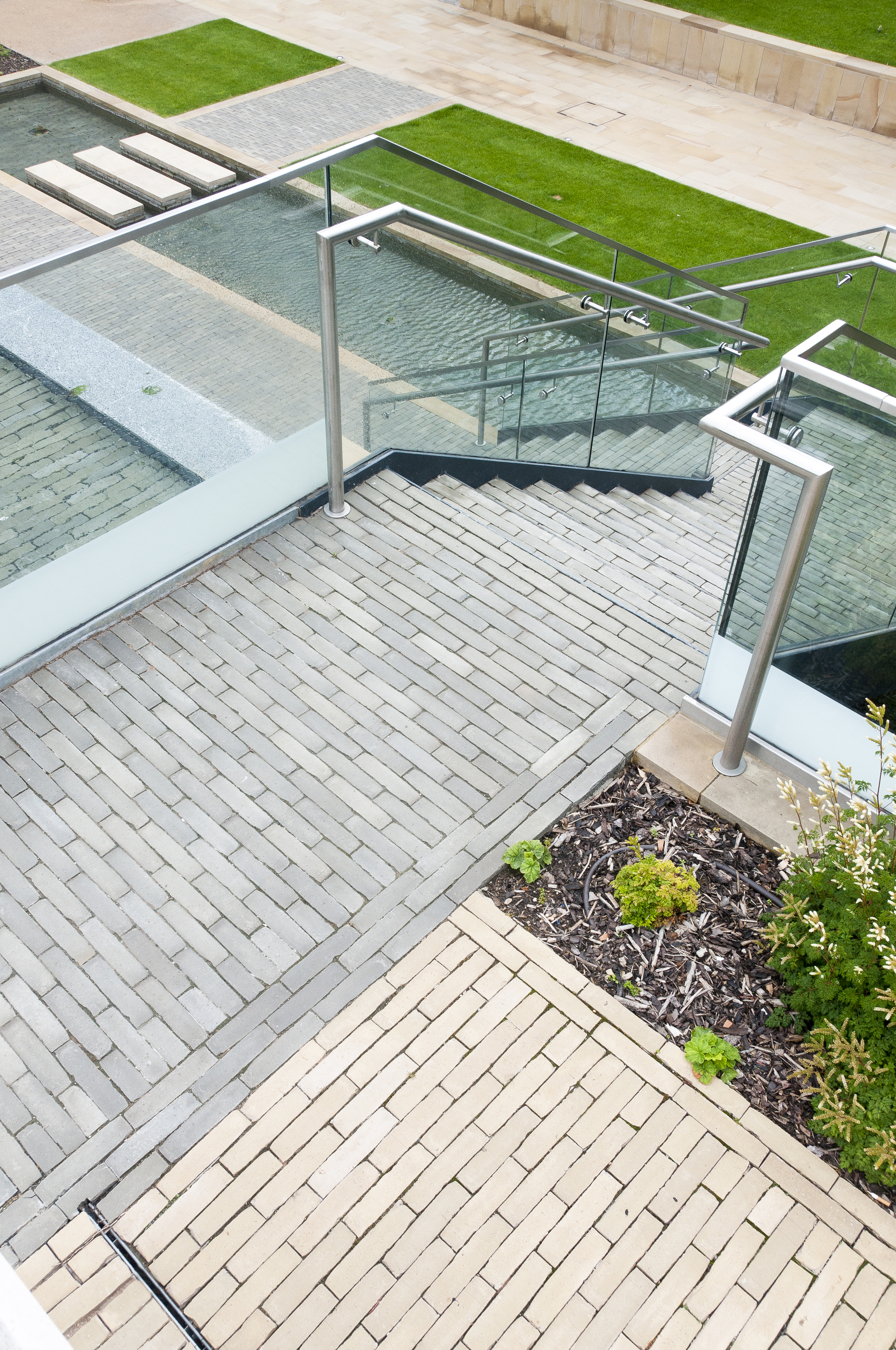 Stretcher bond paving – the paths have been laid on a bed of sand while the brick slips in the water features have been bonded using resin mortar