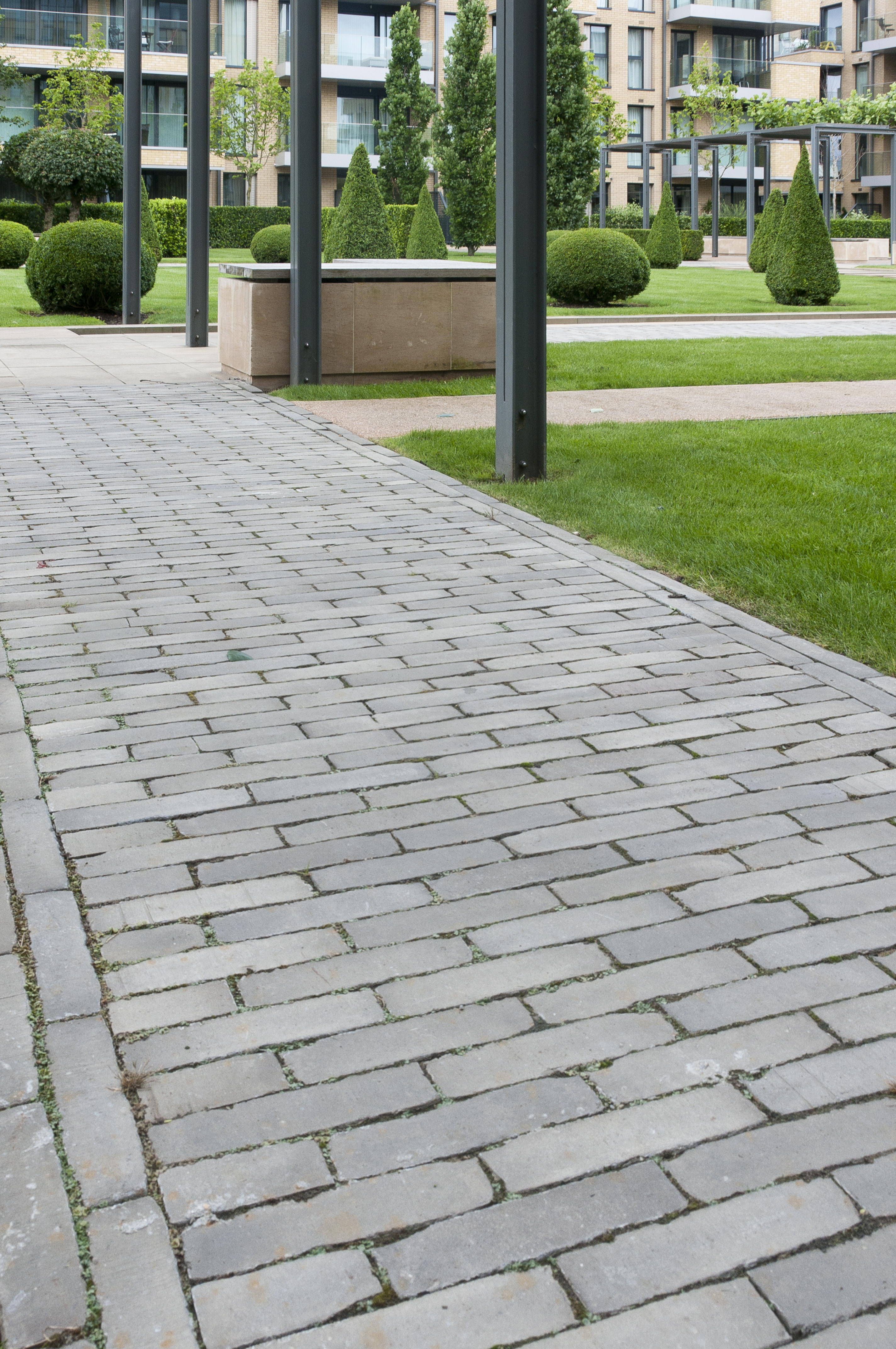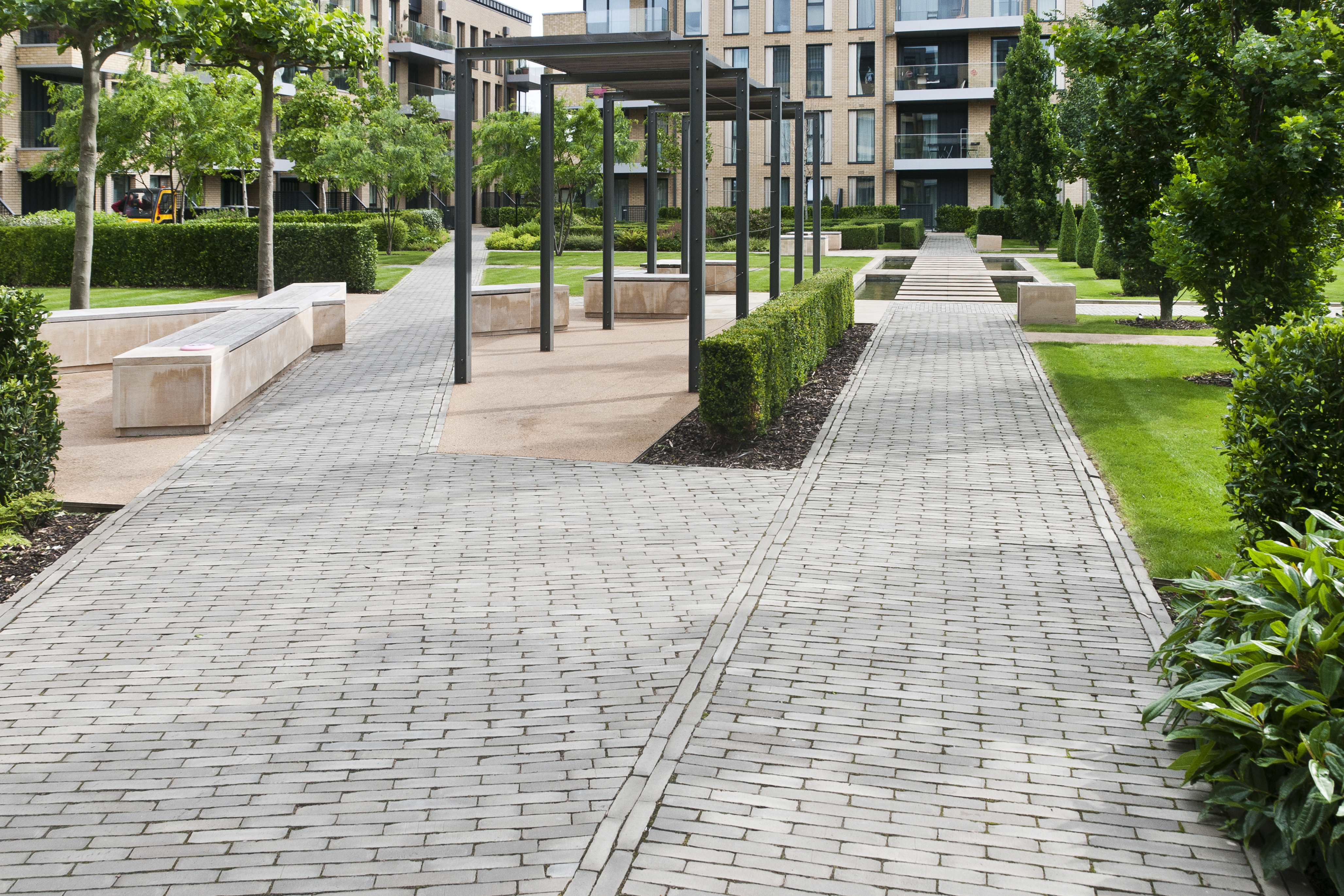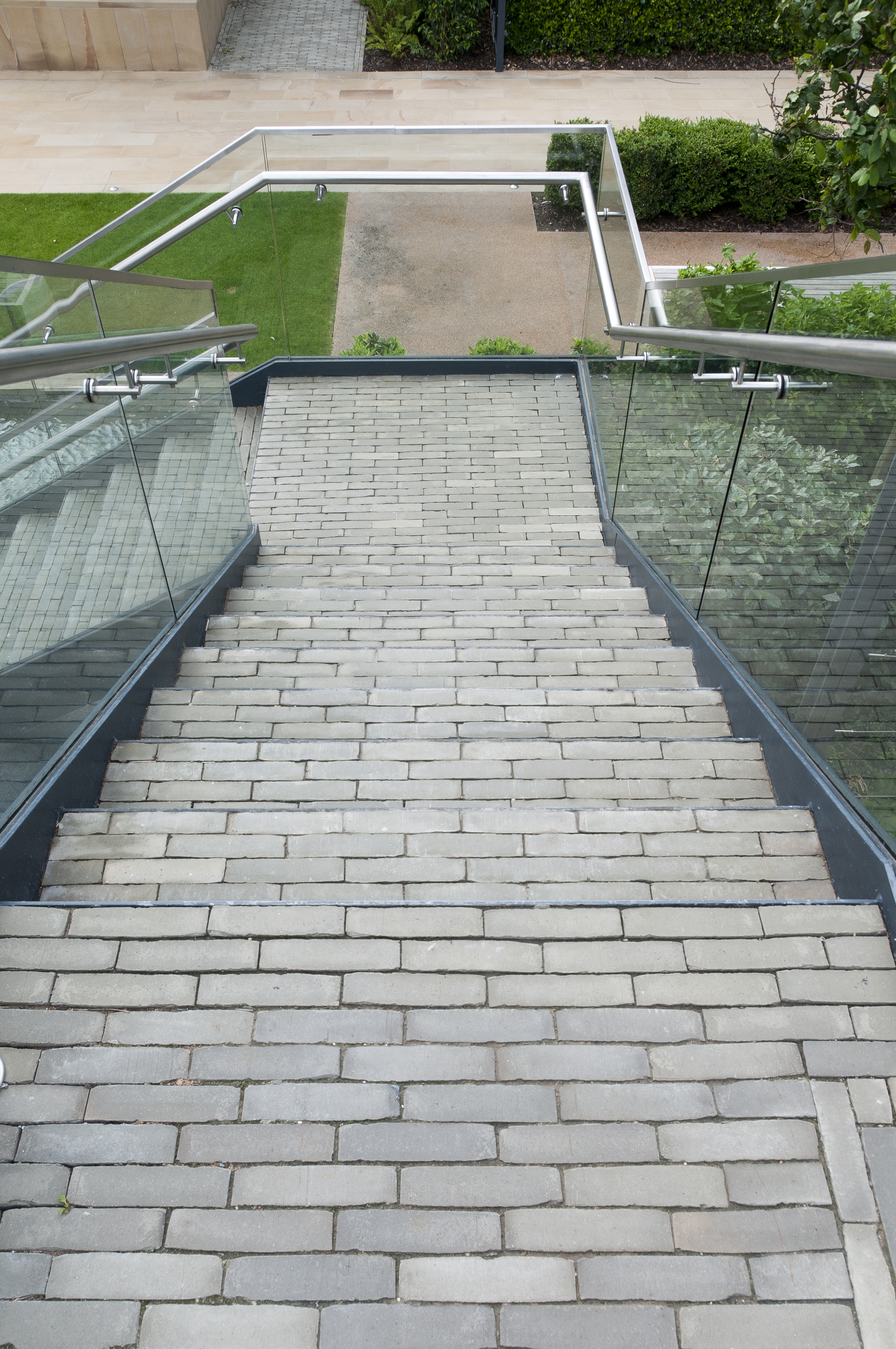 Stretcher bond paving – the paths have been laid on a bed of sand while the brick slips in the water features have been bonded using resin mortar