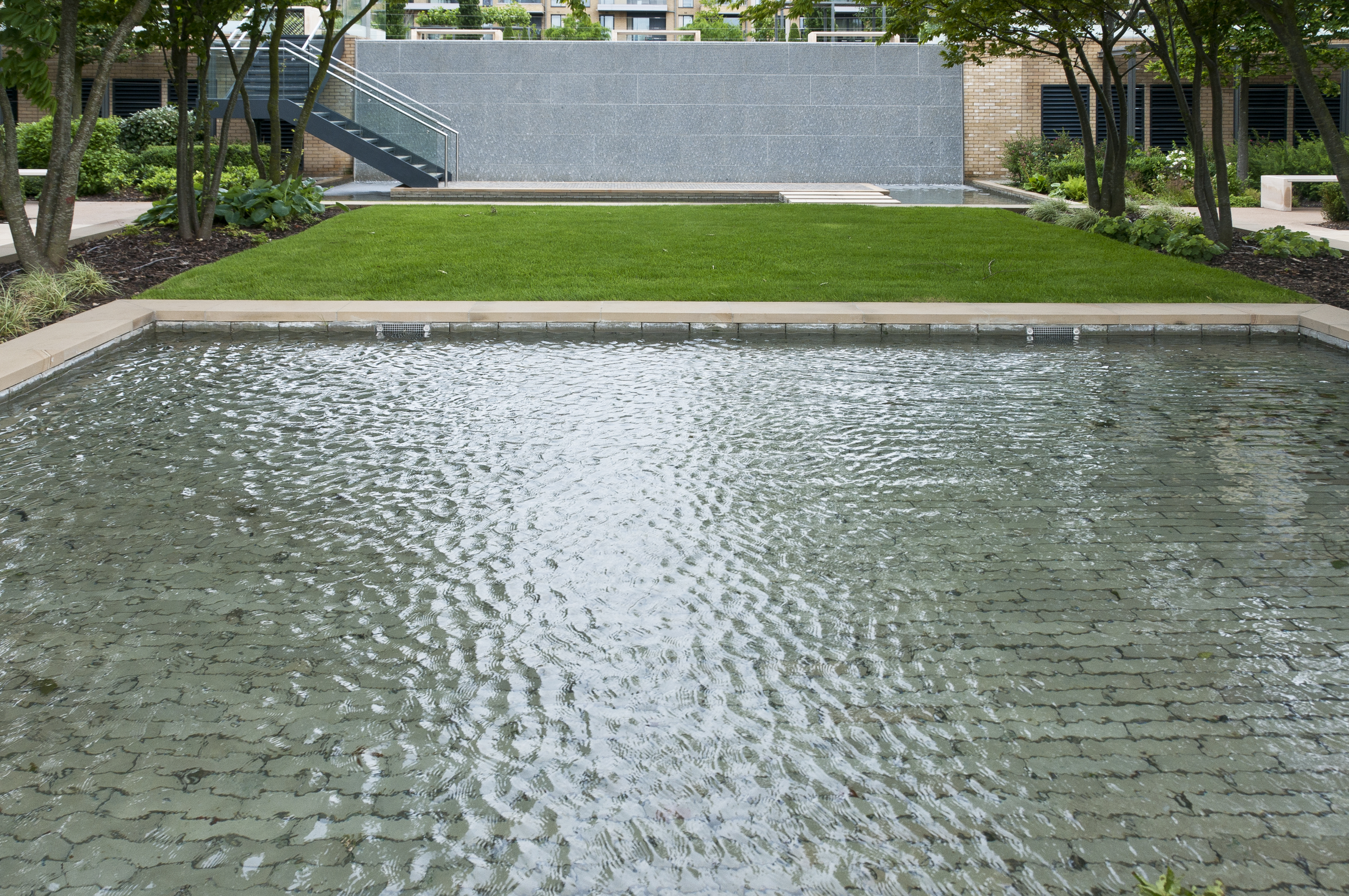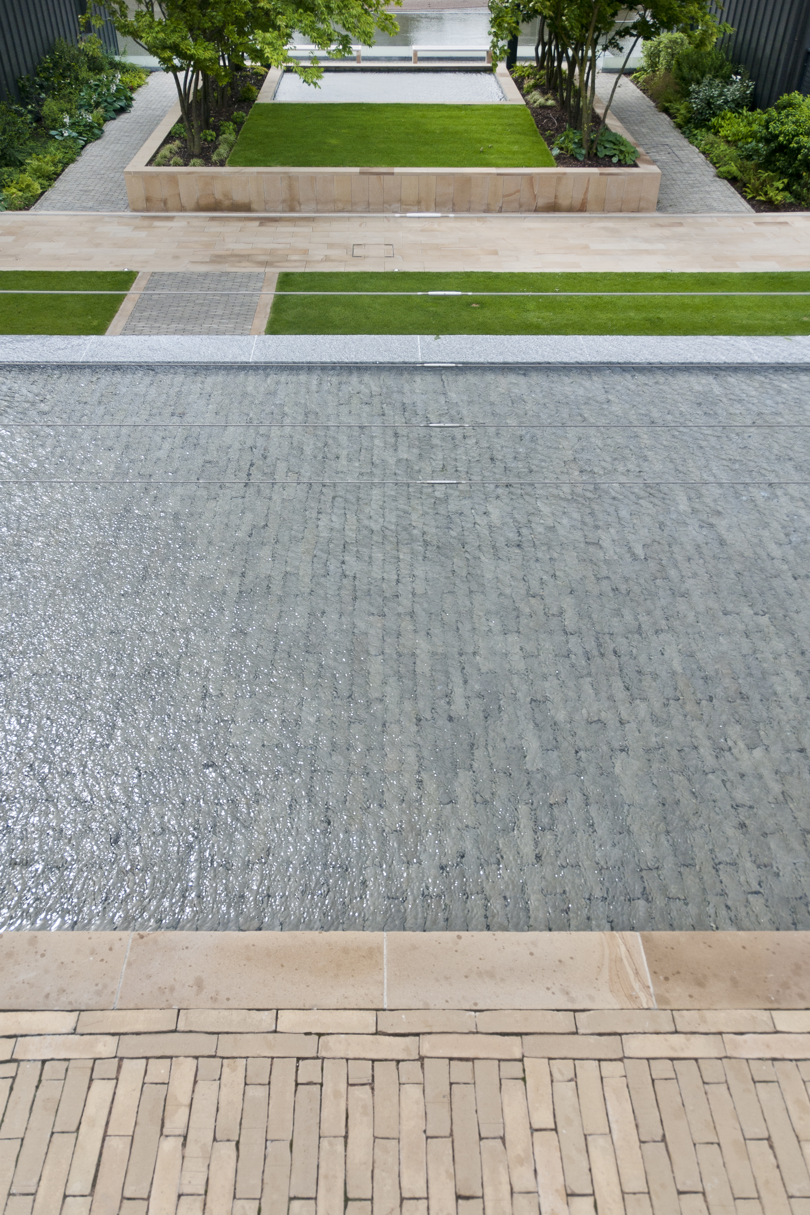 The water features comprise various precisely designed rills that channel water through the gardens. The water flows into a large pool before cascading over the 3-metre high waterfall. On the lowest level, an artistic steel arch has been installed to frame the wonderful panoramic views of the Thames from the fourth level.