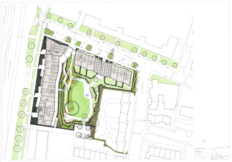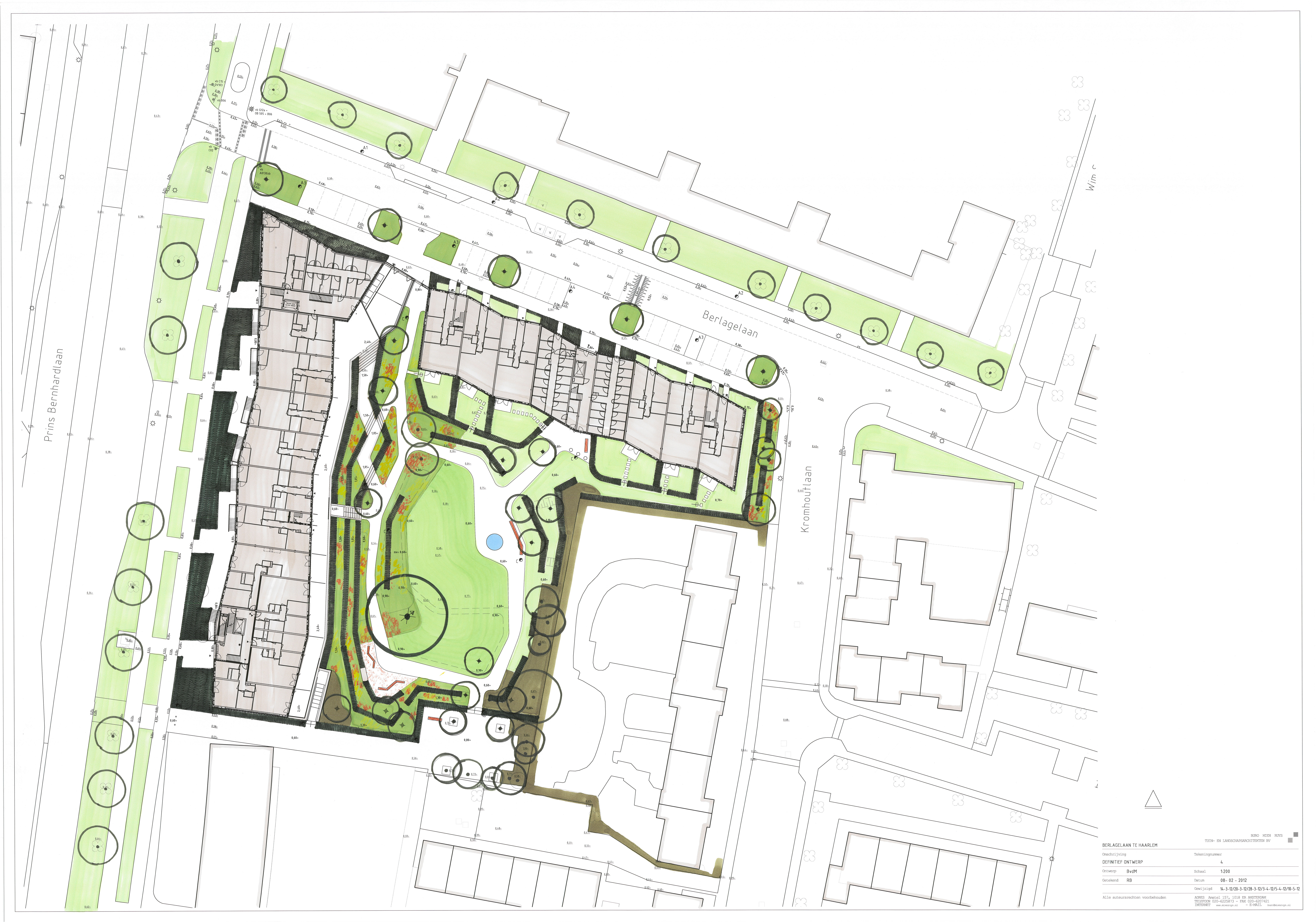 The residences on the busy Bernardlaan lie on a plinth which also contains the car park. The difference in height between the building and the garden is 1.80m.