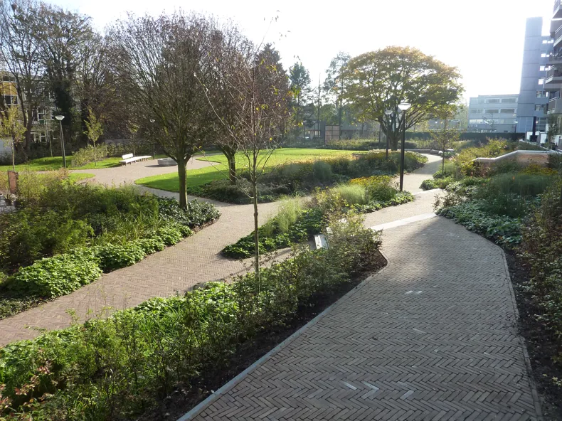 The Waal brick-style clay pavers from Vande Moortel were laid in an ongoing twill design in order to follow the organic pathway pattern as effectively as possible. The Vande Moortel pavers were chosen due to their beautiful sepia colour that matches the façade bricks in all their yellow and blue hues, the natural brick steps and the planting.