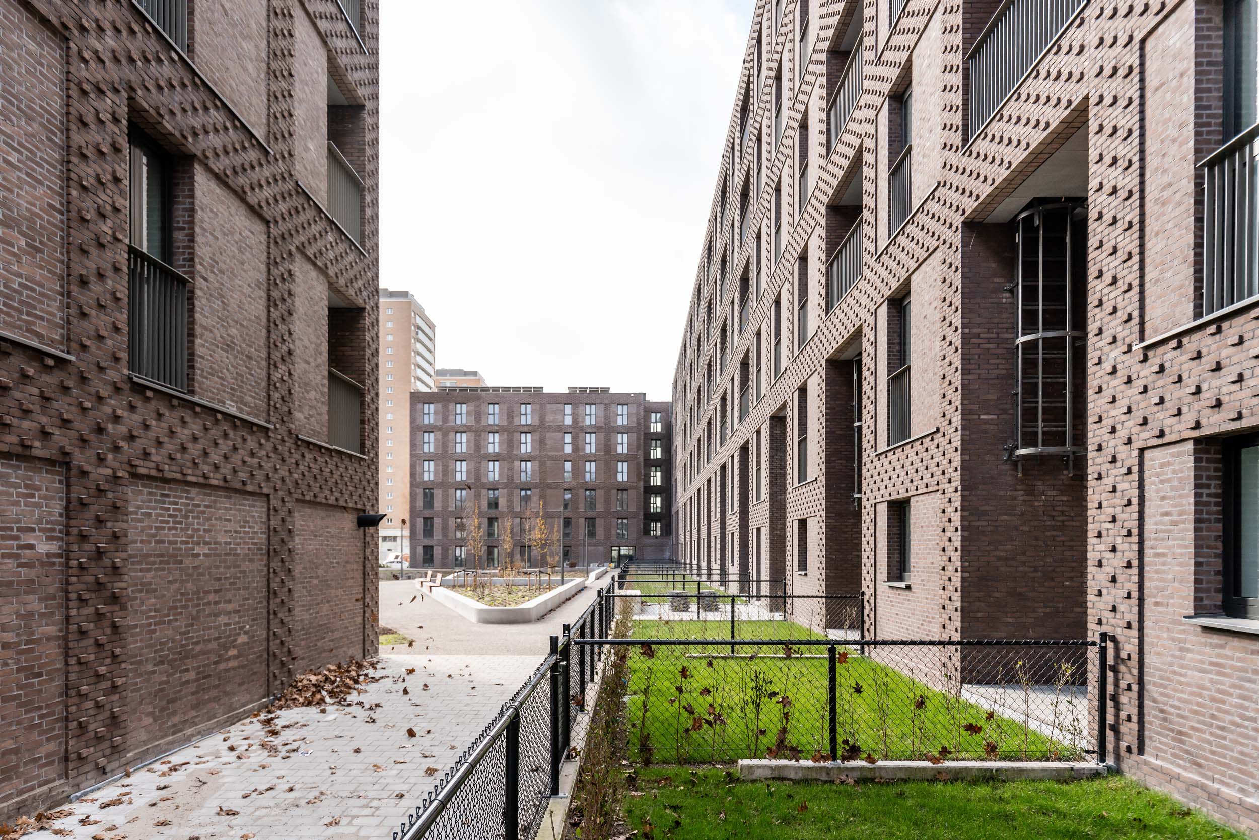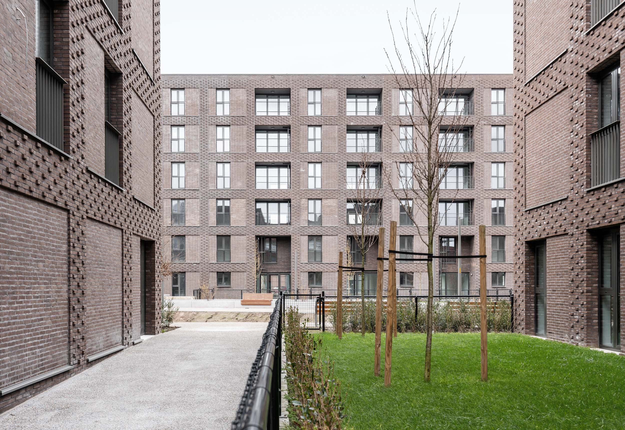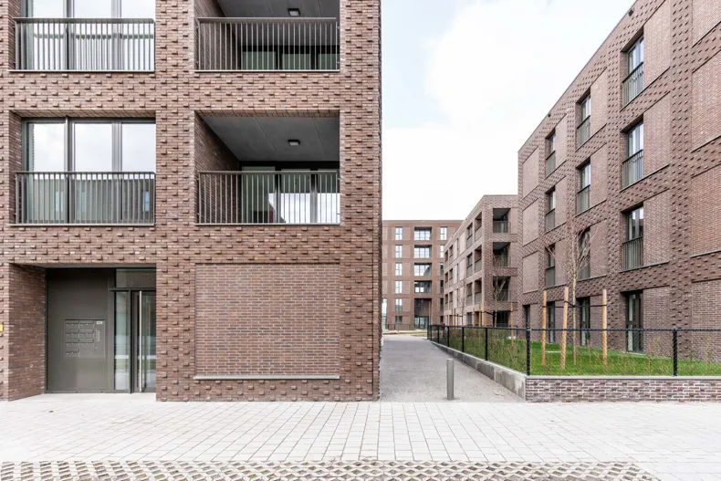 LUCA II is fully committed to social housing. Sustainability, cost efficiency and low maintenance were high on the agenda from the start. The choice of brick as the facing material fits in perfectly with that narrative. Yet it is primarily the special way in which the brickwork has been laid that is going to attract the most attention. All the buildings have been finished using sEptEm 8025, a brown ecological moulded brick which was applied in two formats in order to give the façades extra texture. Recessed brickwork alternates with protruding headers, creating a sort of grid structure that creates a particular articulation. The single massive blocks suddenly acquire more rhythm and dynamism while at the same time, the brick grid structure allows for flexibility and diversity in terms of the plans and interiors. The long six-storey block on Noorderlaan forms a buffer that shields the courtyard, for example. Then on the other sides of the block, a more open development with smaller four-storey volumes has been opted for. To guarantee more privacy, both the ground floor and the courtyard were raised 55 cm above ground level.