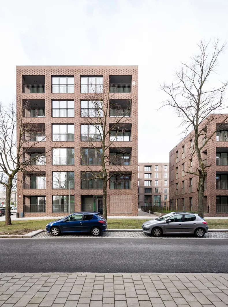 The environs of the Luchtbal district in Antwerp is characterised by its enormous diversity. The open urban plan dates back to the modernist past and incorporates both typical garden suburbs and classic closed housing blocks. Even more variation is added to the image by the presence of large industrial buildings on the opposite side of Noorderlaan. All these aspects have been incorporated in the design of LUCA II which fits in perfectly with its context. The construction project consists of single blocked volumes, designed in accordance with the principles of a garden suburb. In addition, each individual building is a subtle nod to its immediate surroundings. The volumetry of the whole project was conceived as a composition with one long six-storey volume on Noorderlaan and with several smaller volumes ranging from four to six floors along Canadalaan and Manchesterlaan. In this way, the urban design concept carefully brings together the different worlds of the Luchtbal district.