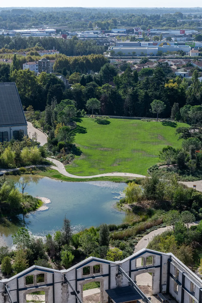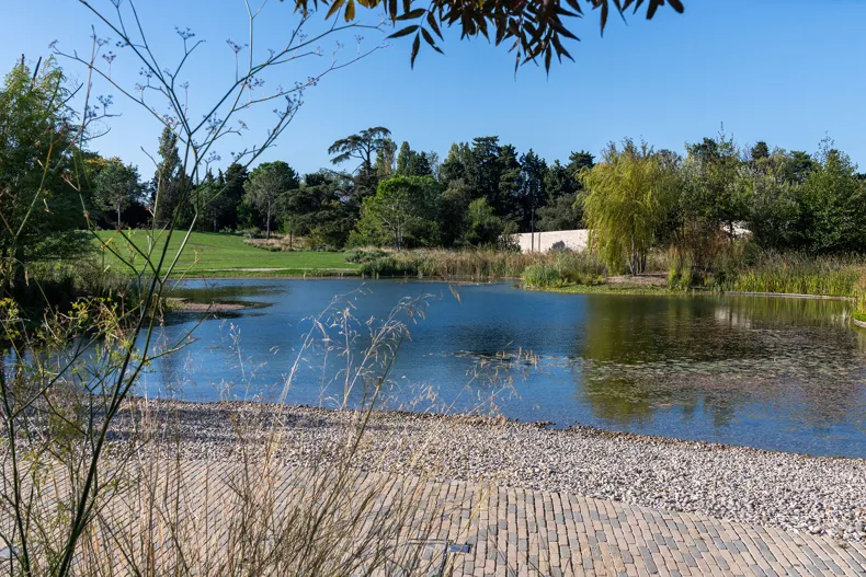 The vegetation growth is made possible by a sustainable water circulation system that draws its source from the Craponne canal located near the park. The large central pond serves both as a water reservoir for irrigation and as a cooling device on hot summer days. The pond, as well as the new topography and its vegetation, produce a microclimate, effectively transforming the former concrete desert into an agreeable public park.
