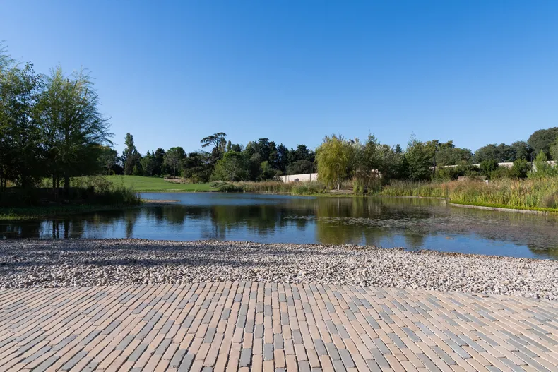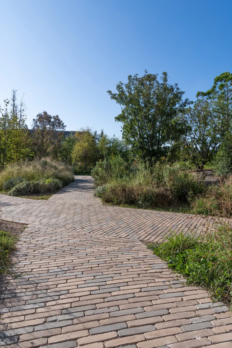 Organically shaped paths of Clay Pavers make it possible to stroll around in this inspiring setting and guide visitors from one building to the other. To create these paths the ECO-7-SIZE SeptimA Clay Paver was chosen in three different colours to create a mix specifically for this project. Combined the grey and two yellow pavers create a pallet that resembles the colours found in the areas surrounding the park. This pallet lets the paving blend into the project an creates a unity throughout the park.