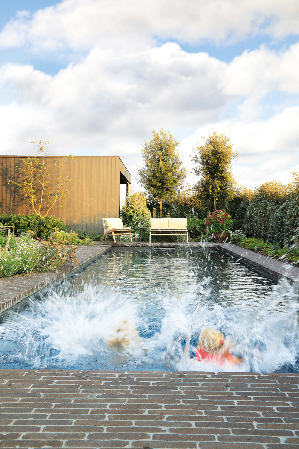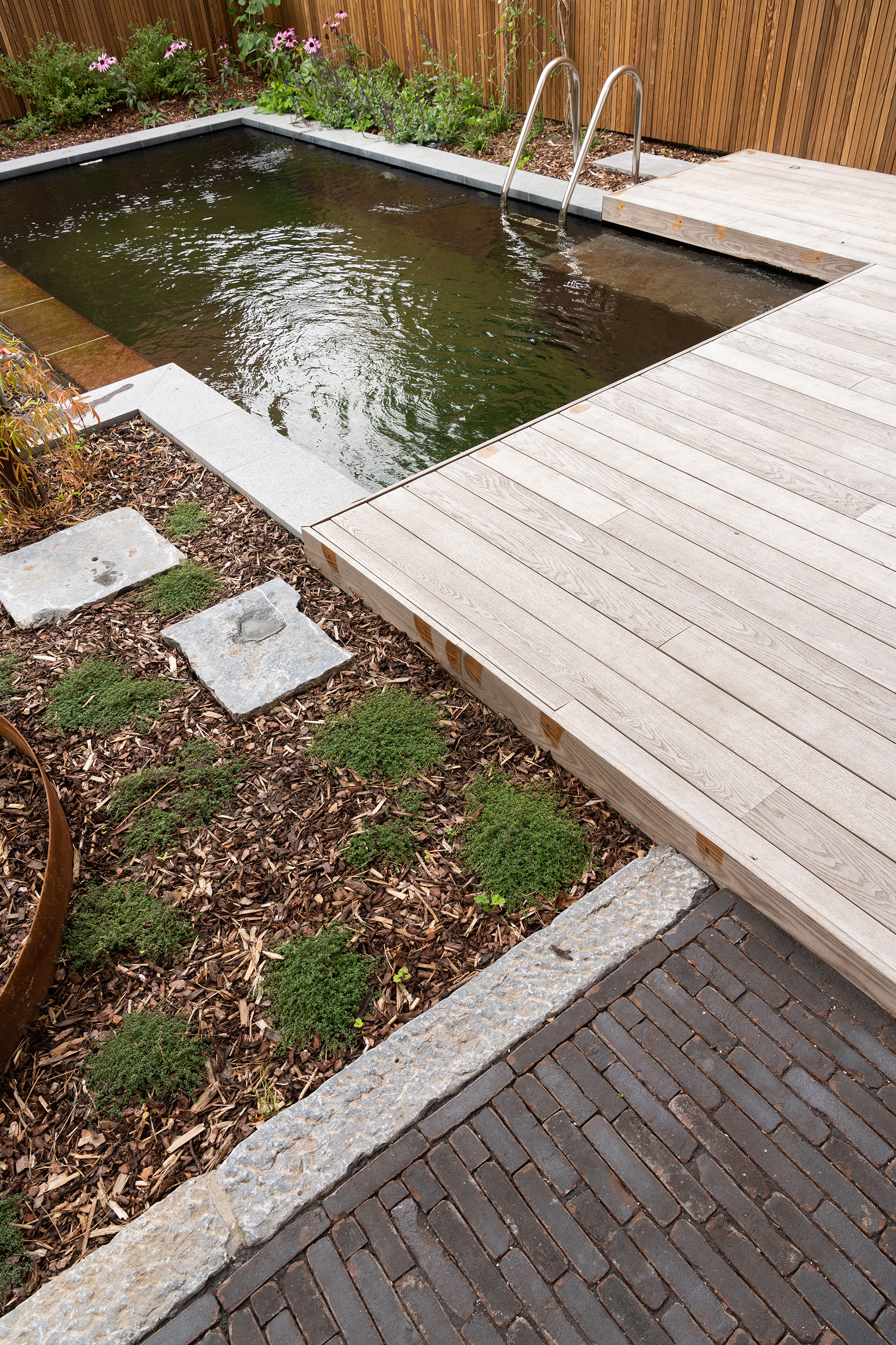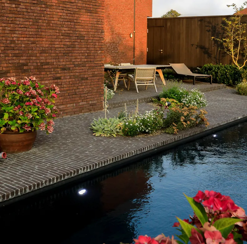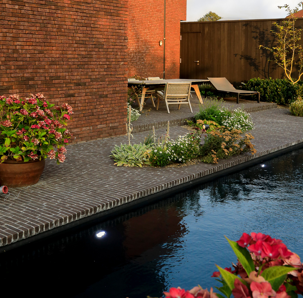 Stijn Ameloot created a garden design that featured an impressive interplay between the planting, the clay pavers and the swimming pool. The precise, detailed, high-quality finish is ensured by a combination of features including the creative and playful borders and the beautiful monolithic edging around the swimming pool, constructed using mitre-cut SeptimA Onyx clay pavers bonded and laid on edge.