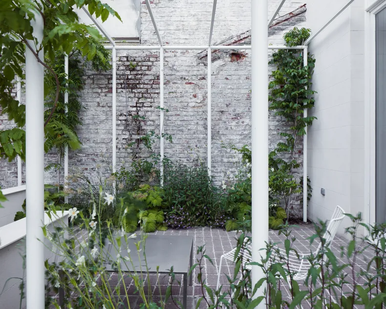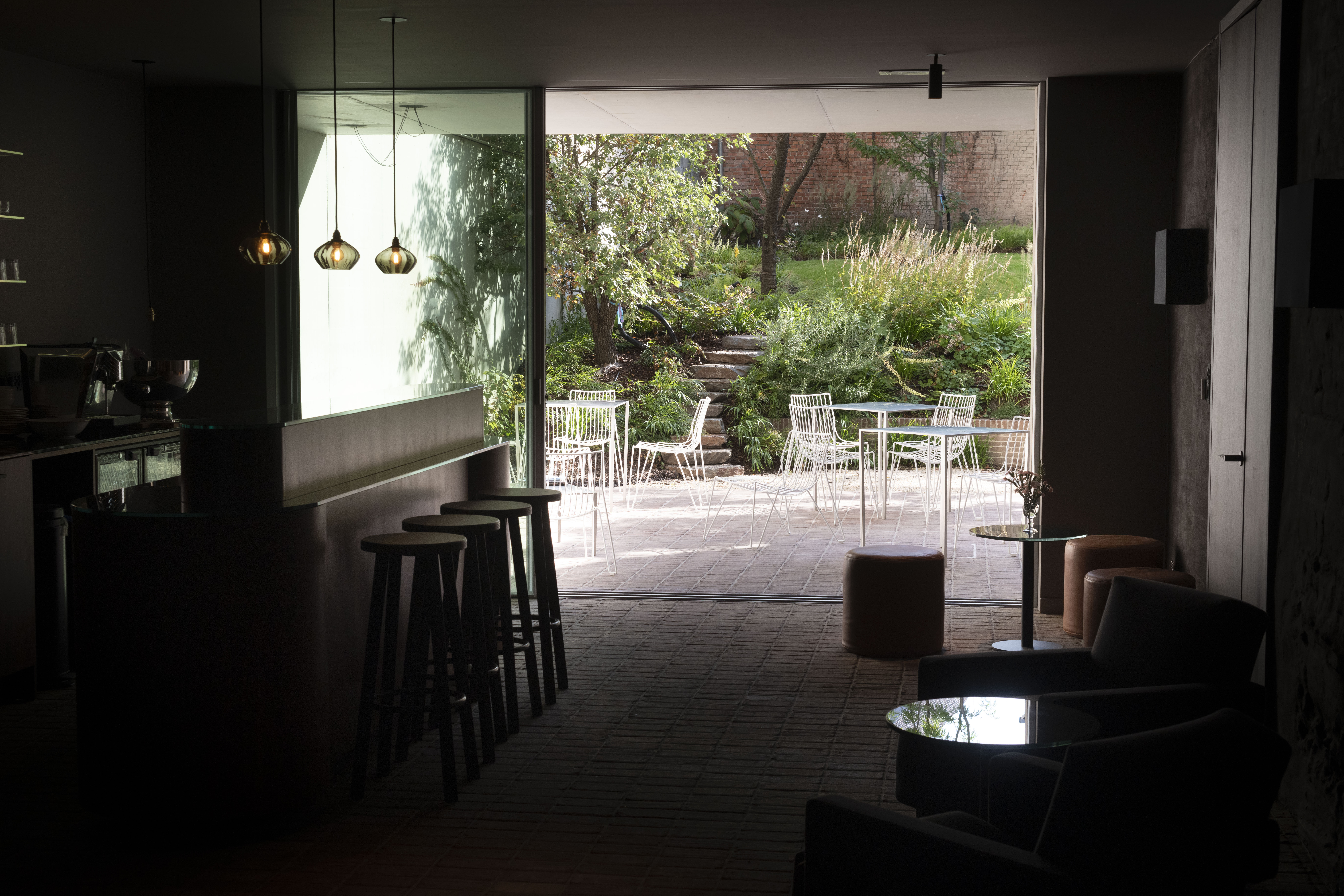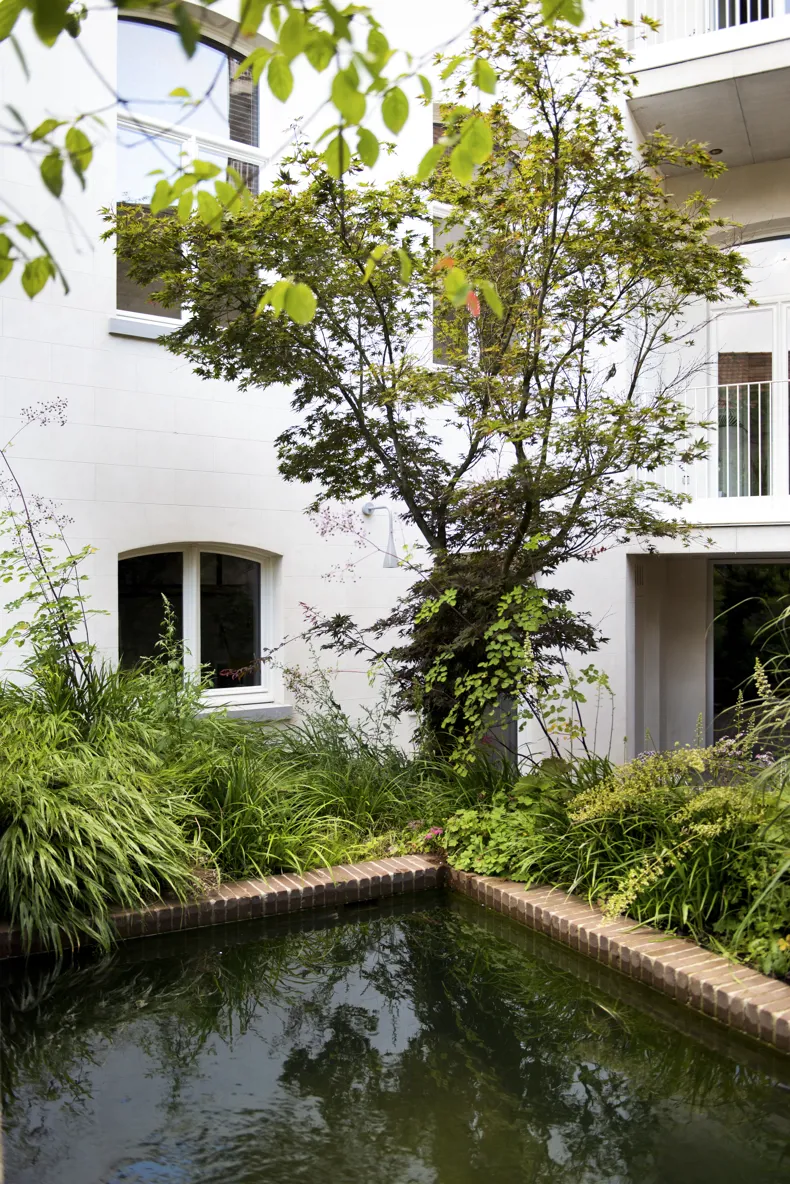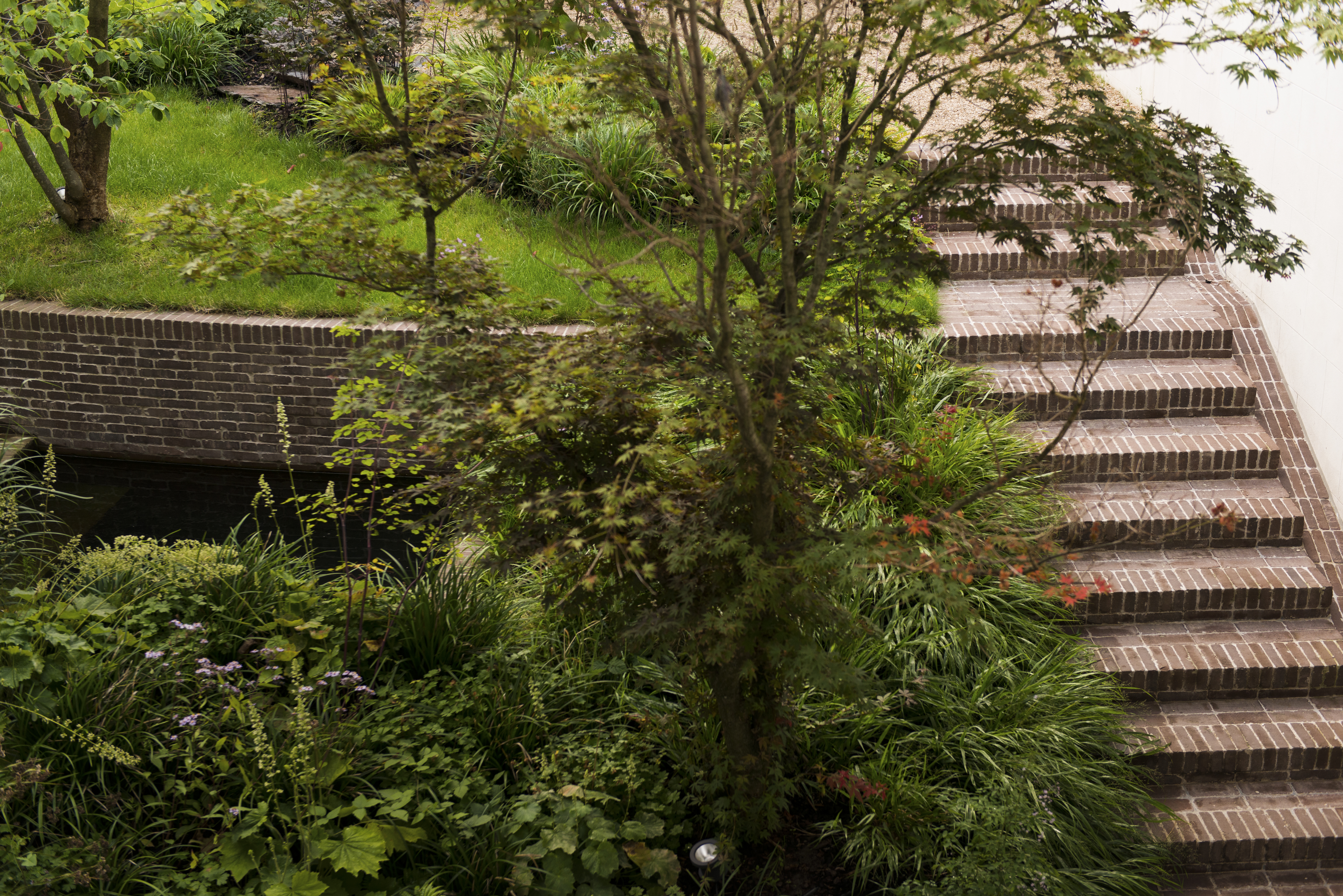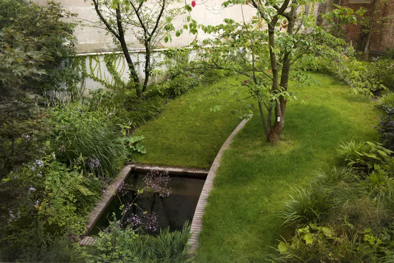 The pavers start from the basement and flow via the terrace to merge into the steps, retaining walls and pond that make the visual connection with the brick wall of the coach house. The sleek full-brick bond of the clay pavers blends beautifully with the lush playful planting. The clay pavers were laid in the same pattern as the floor indoors, reinforcing the sense of uniformity and drawing you into the garden, as it were, when the sliding door is open.”
