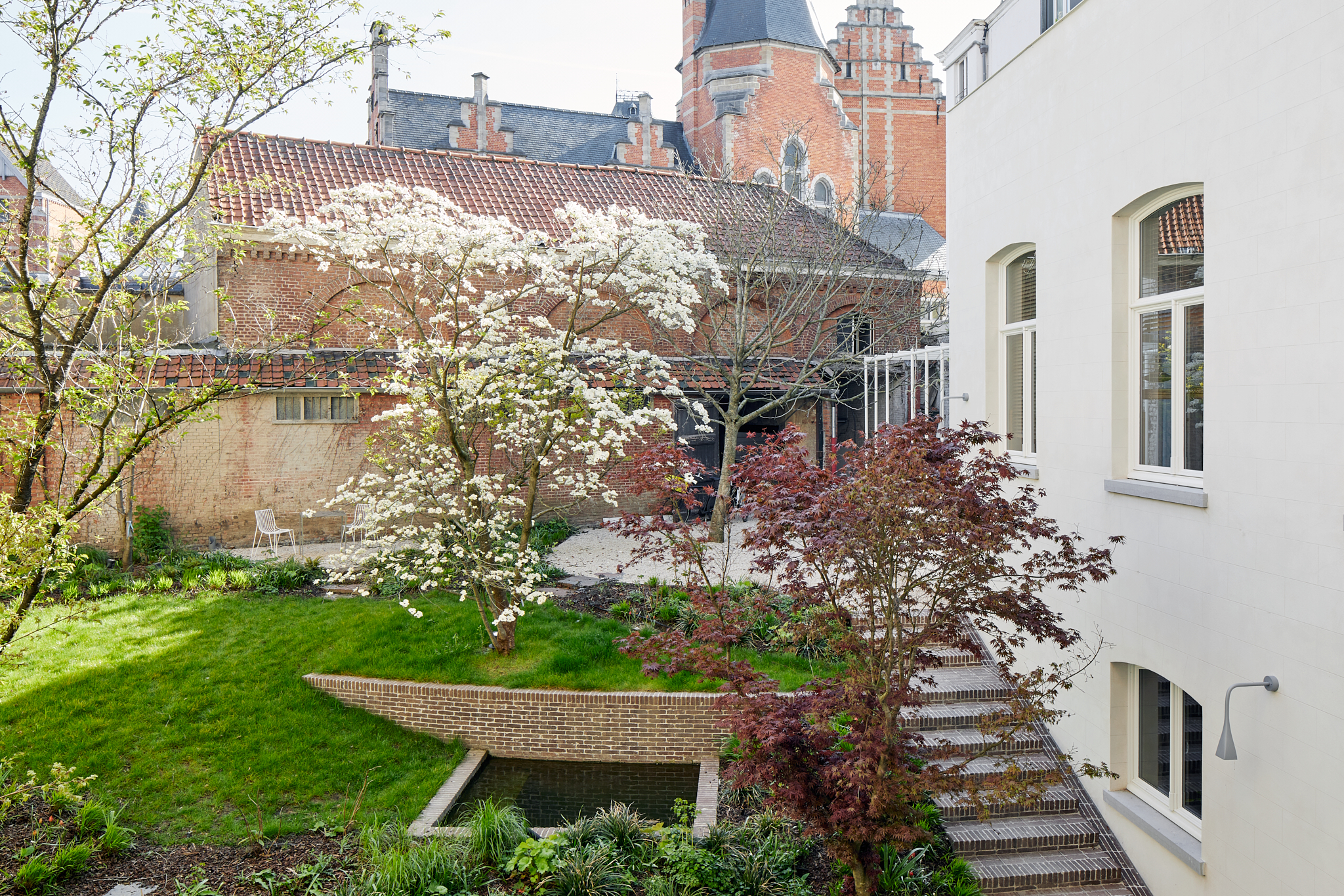 The importance of the history of the site also featured in the design of this green oasis. The enclosed garden covering an area of approximately 300 m² is adjacent to an old coach house which also forms the rear façade. The authentic Ancienne Belgique Camel clay pavers seamlessly link the new and old architectural designs.