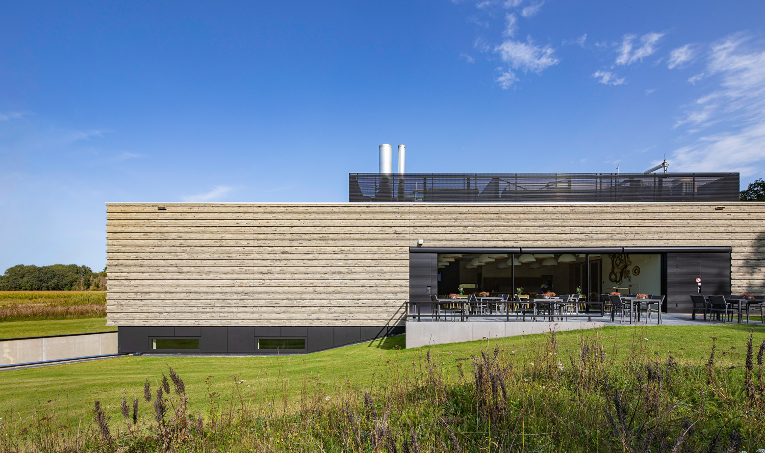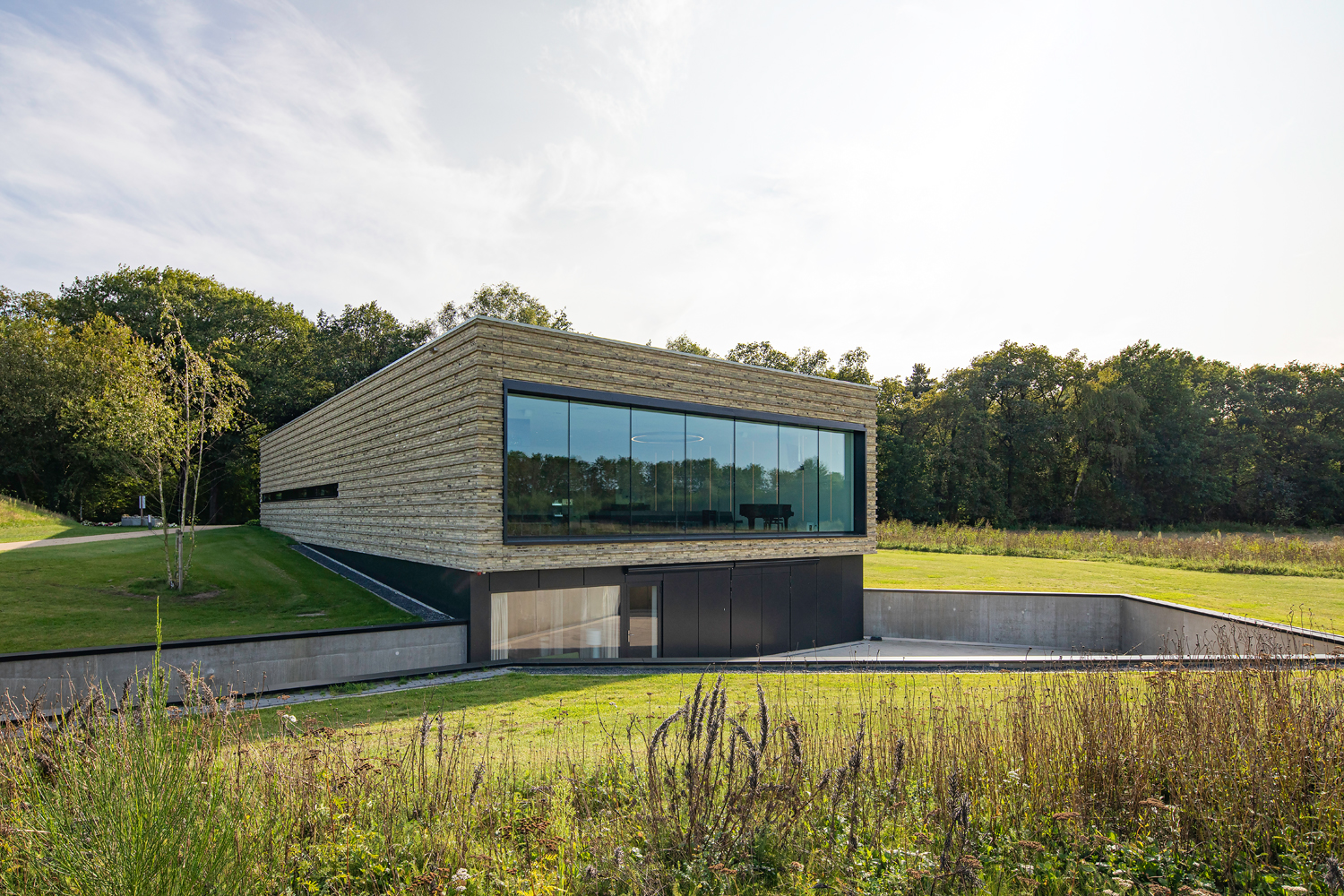 The new Oldenzaal Crematorium is situated in a beautiful location, near the cemetery, in a landscape characterised by wooded countryside and gentle hills. The small developed area – initially only earmarked for a cremation area – led to the sleek, compact design in which the ceremony room and the reception room are positioned above the cremation area. This called for a mindful study of the internal logistics and, in particular, the transporting of the coffin from the lower floor – half of which is below ground – to the ceremony room above. A special hydraulic lift was designed for this purpose.