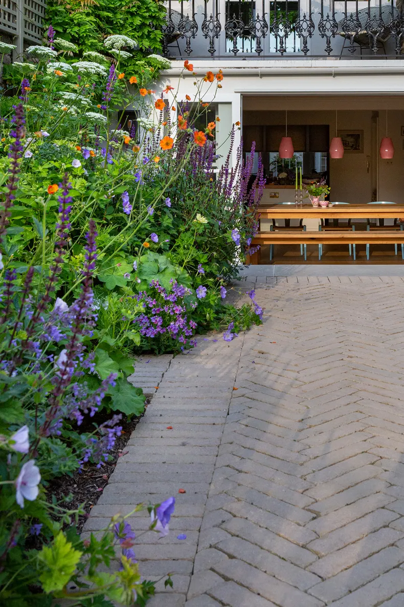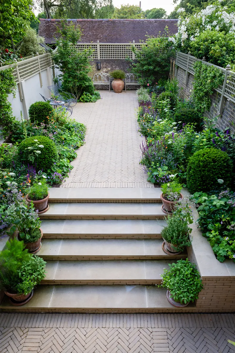 The design is enhanced through the SeptimA Aureum clay pavers as they are a gentle colour blending well with the planting scheme and providing a soft backdrop to the greenery, helping the colours of the planting to really take the foreground and pop. To add further interest, we laid the pavers in a Herringbone formation on the lower terrace and then along the main central path leading up to the far end of the garden.