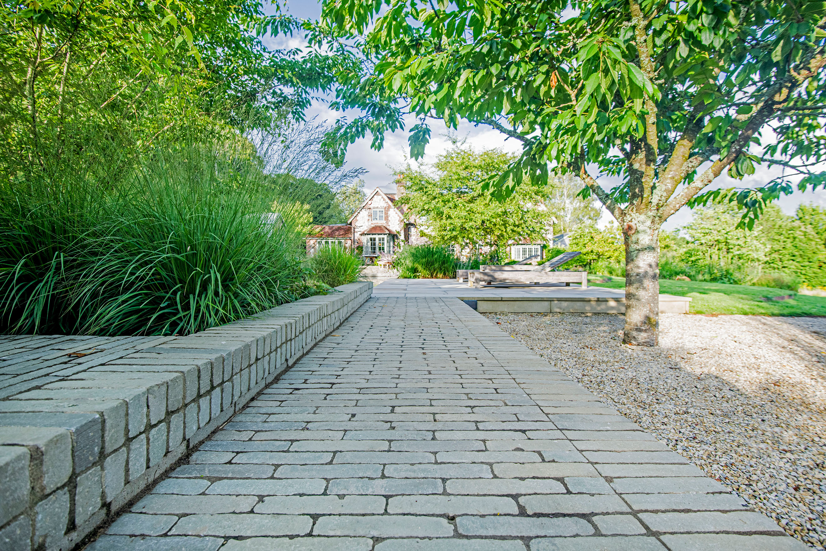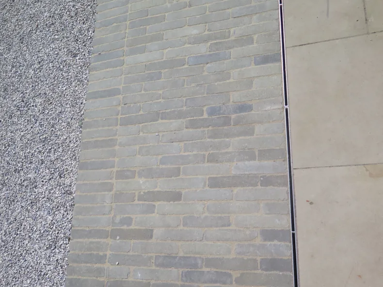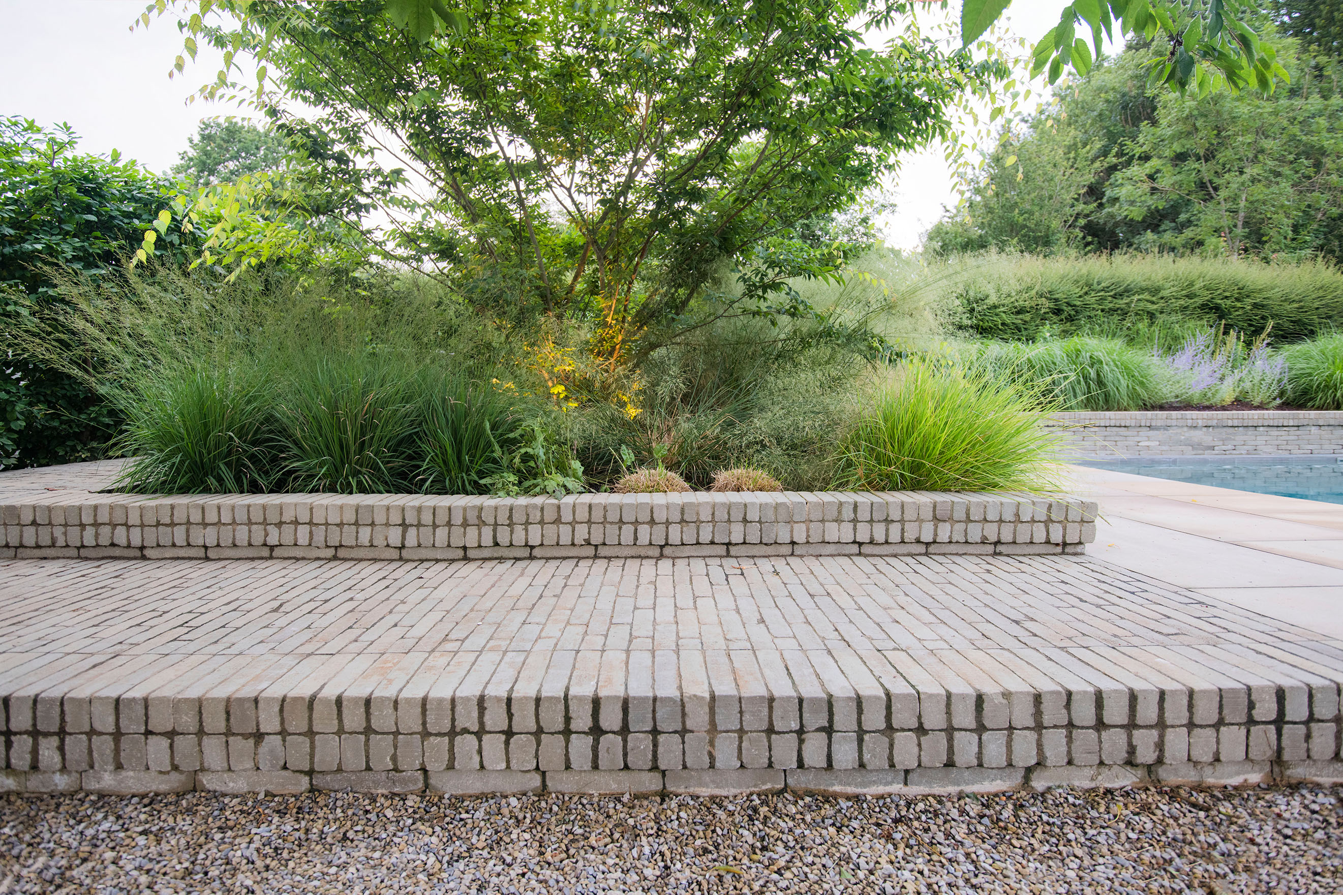 The Olive clay paver also complements and contrasts beautifully with the York stone paving and loose gravel used for the other hard standing areas. It is particularly effective for the walls of and steps down to the swimming pool which has been built into a steep slope in the garden, and the clay pavers have been used for the higher wall on one side to great effect.