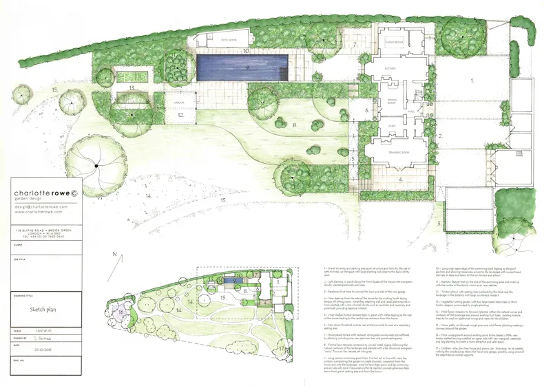 This included the addition of an outdoor swimming pool to the rear of the house and the reconfiguration of all the outdoor terraces with the complication that the garden is steeply sloping. Charlotte Rowe decided to place the pool outside the main living room of the house as it was the perfect location, running East to West but this meant that the pool would need to be set into a sloping area of the garden close to the property boundary which was tricky both in design and construction terms as one side of the pool edge would need to be higher than the other.