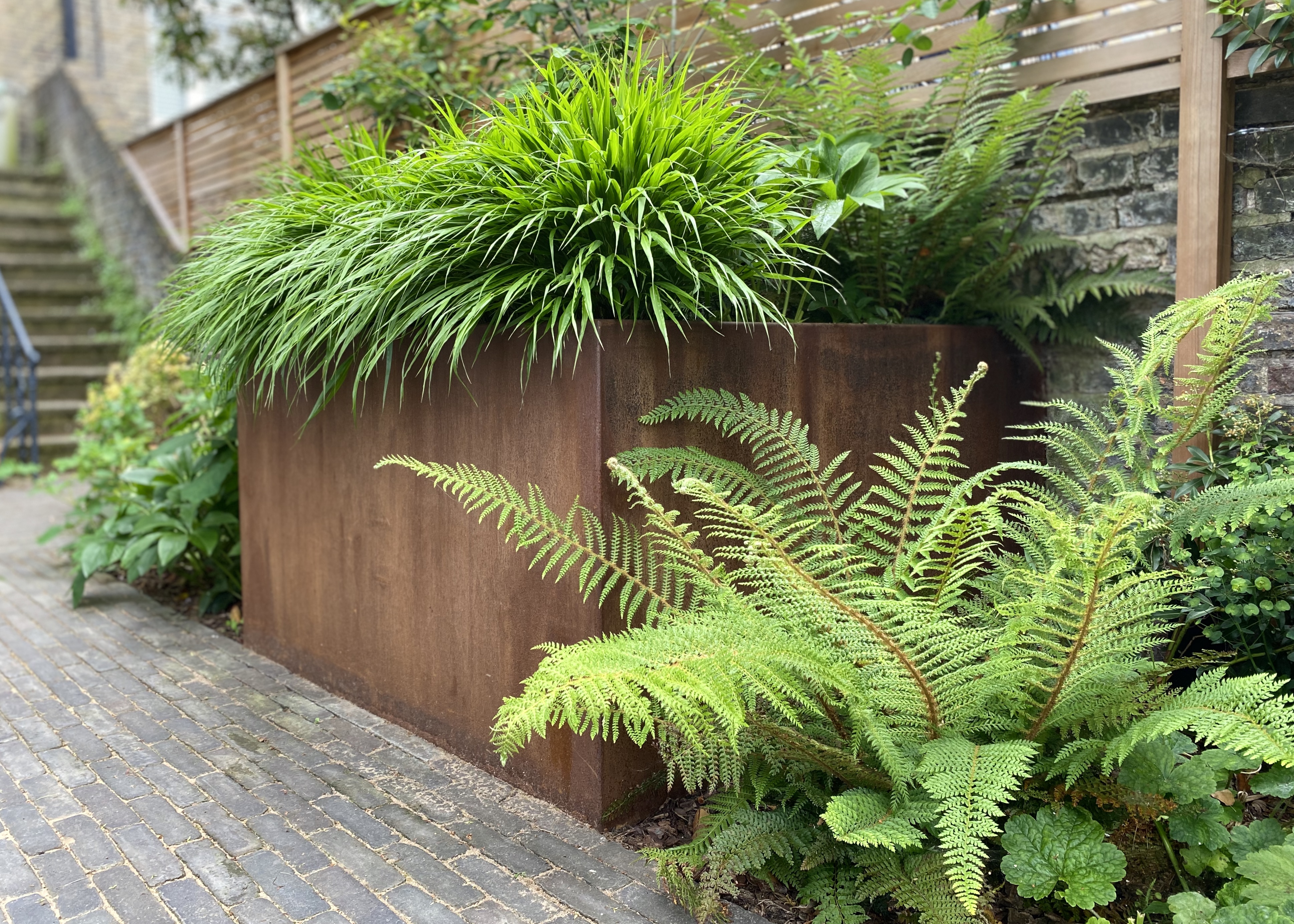 The mature trees on site were retained, with existing dated brick planters replaced by contemporary corten steel. Corten was also used to trim the green roof on the new bespoke cedar clad storage shed, with cedar slatted trellis along the garden walls to improve privacy. The mixed planting scheme adds texture and colour and helps soften the space.