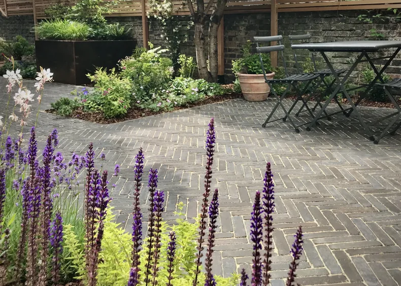 The clay pavers added a contemporary feel, working well with the corten steel planters and were the perfect choice to complement the clients' house with its dark grey paintwork. The garden was used extensively during lockdown and as things opened up became more of a sociable space for family and friends.”