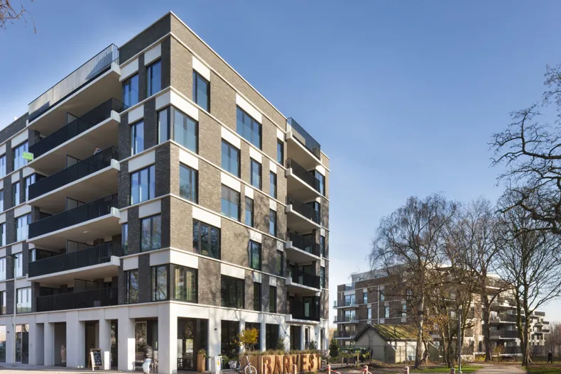 They are interconnected by a wide footpath created using anthracite-coloured clay pavers from Vande Moortel, with a spacious underground car park underneath. The outside space has been interpreted as a park, ensuring that the project blends in seamlessly with the surrounding ramparts.