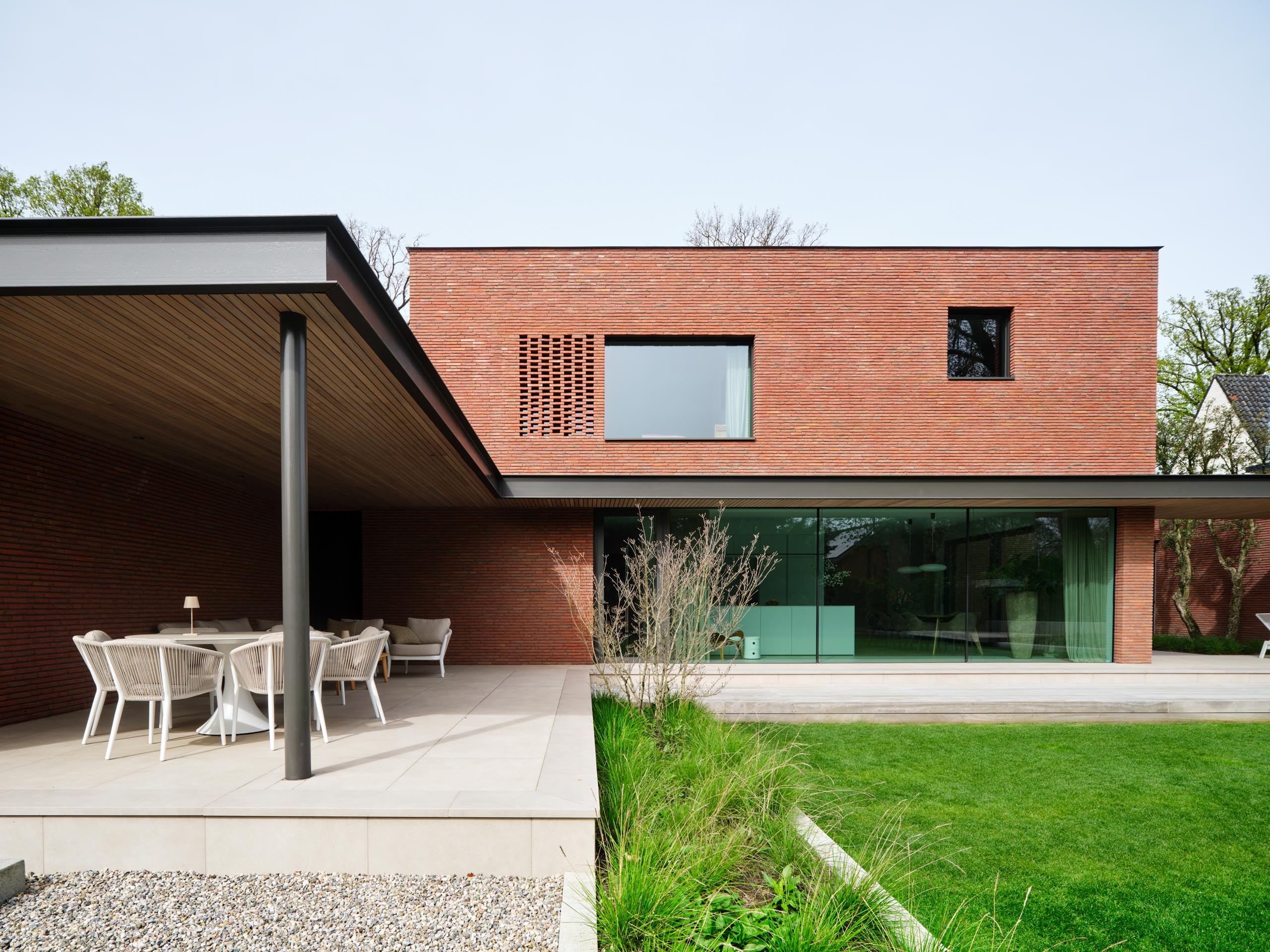 The facing brick is central to the material palette, with other materials carefully chosen to enhance the character of the brickwork. Aluminum window frames in a warm gray hue seamlessly complement the brickwork and enhance the artisanal appearance. At the rear, light cedar ceilings add a natural warmth to the overall effect, contrasting beautifully with the robust brickwork.