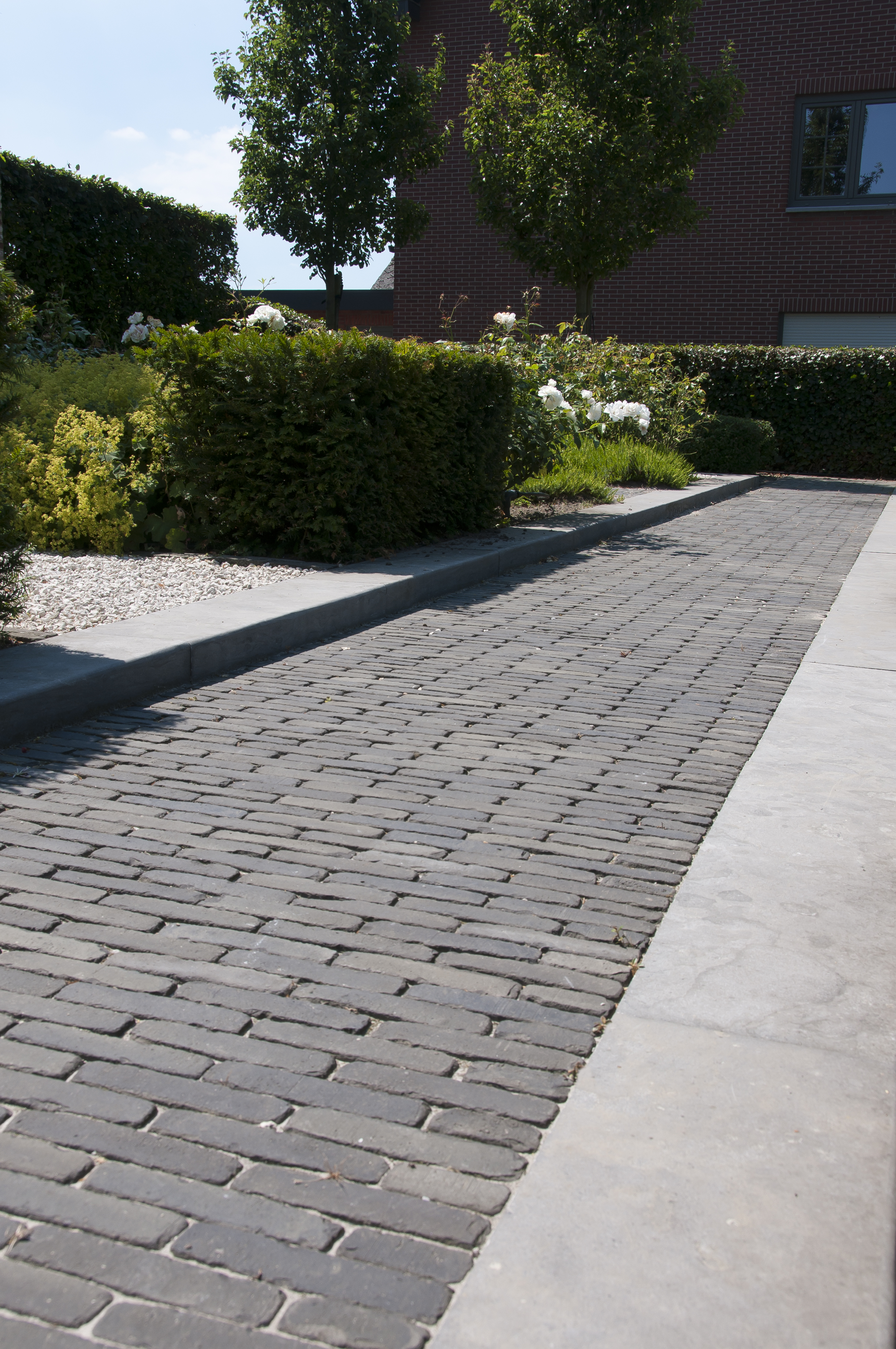 Edging can vary from single kerbstones (a row of clay pavers perpendicular to the bond) supported by sand cement for terraces and footpaths to prefabricated linear concrete elements for driveways and parking areas. Other linear materials can also be used but the edging should always be adequately supported using sand cement.