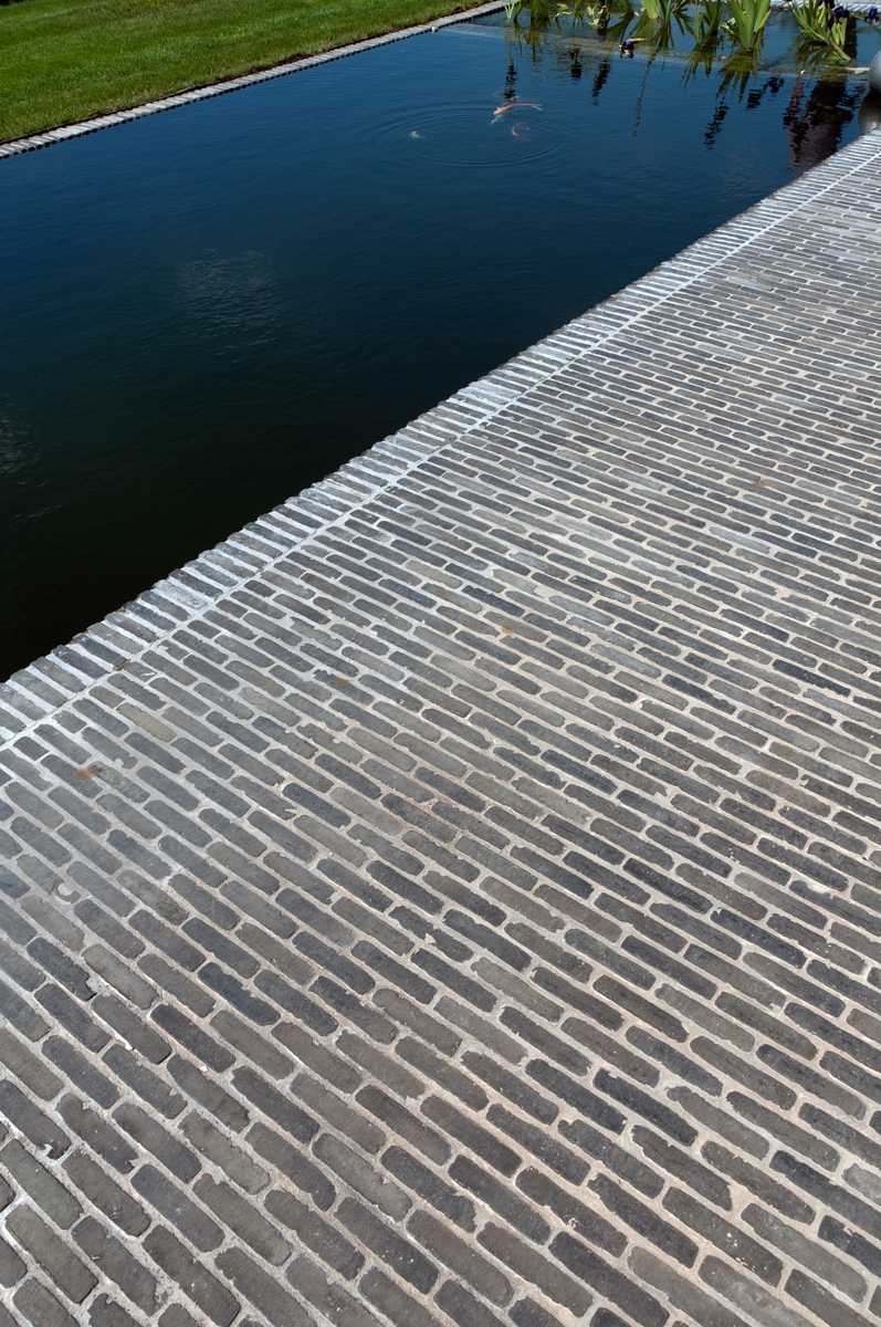 The clay pavers are placed loose against each other with a minimum joint (2 to 3 mm) by means of the click & drop method. By first tapping the pavers together and then lowering them onto the paving layer, the correct joint thickness is automatically achieved and the paving layer remains untouched. If necessary, a slightly wider joint can be used from time to time in order to maintain the bond. Laying the clay pavers so that they are pressed against each other is strongly advised against in order to avoid edge damage.