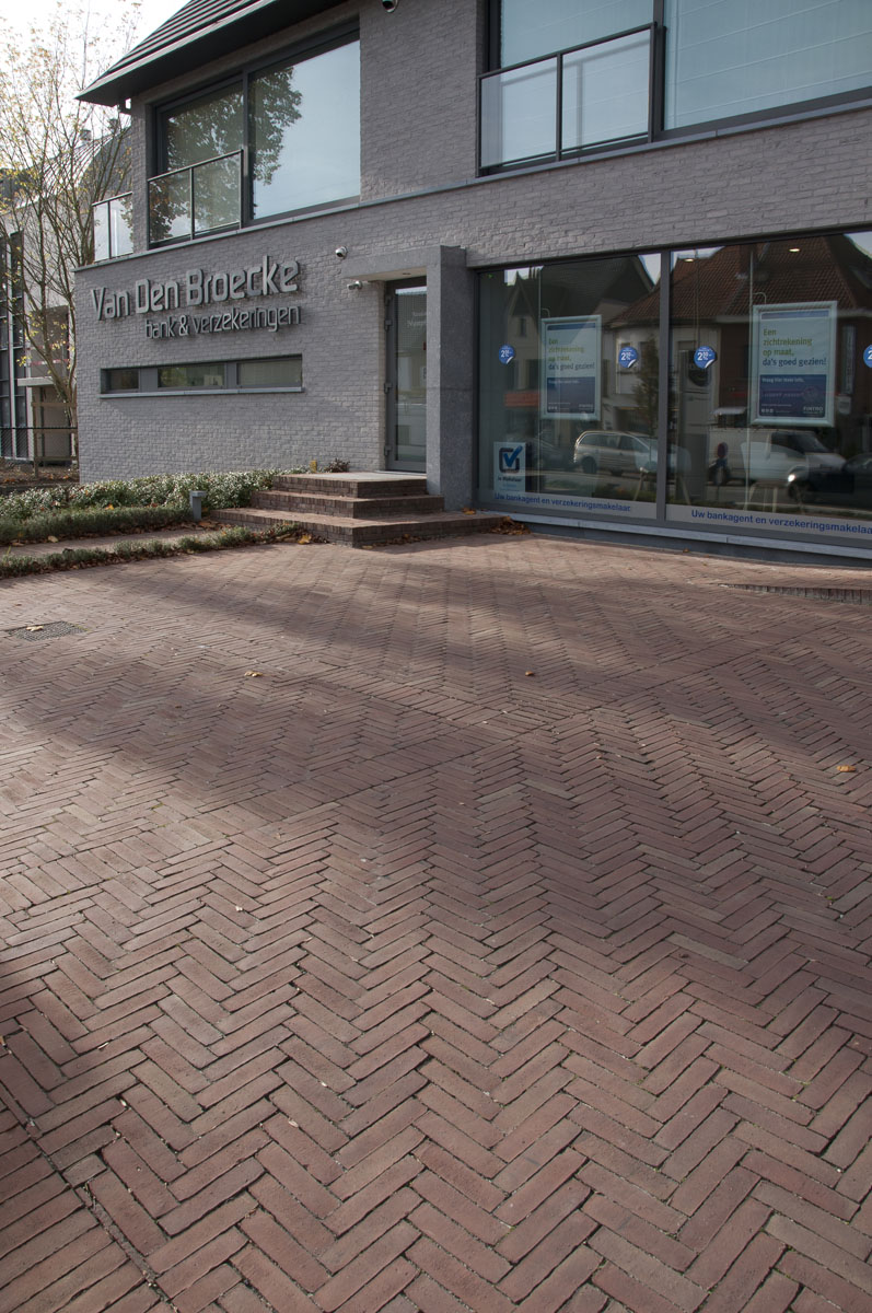 The clay pavers are placed loose against each other with a minimum joint (2 to 3 mm) by means of the click & drop method. By first tapping the pavers together and then lowering them onto the paving layer, the correct joint thickness is automatically achieved and the paving layer remains untouched. If necessary, a slightly wider joint can be used from time to time in order to maintain the bond. Laying the clay pavers so that they are pressed against each other is strongly advised against in order to avoid edge damage.