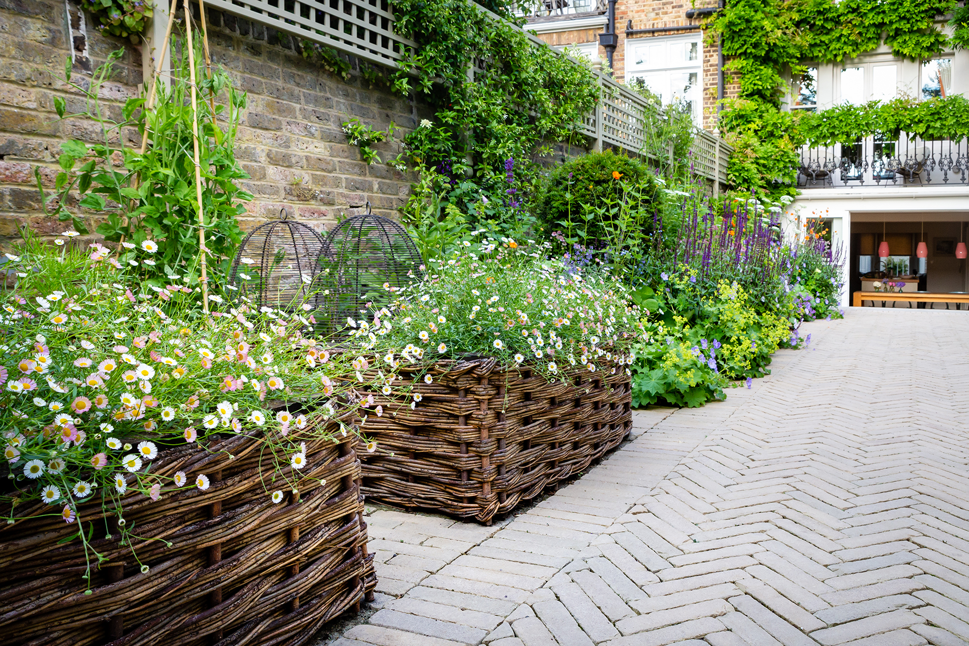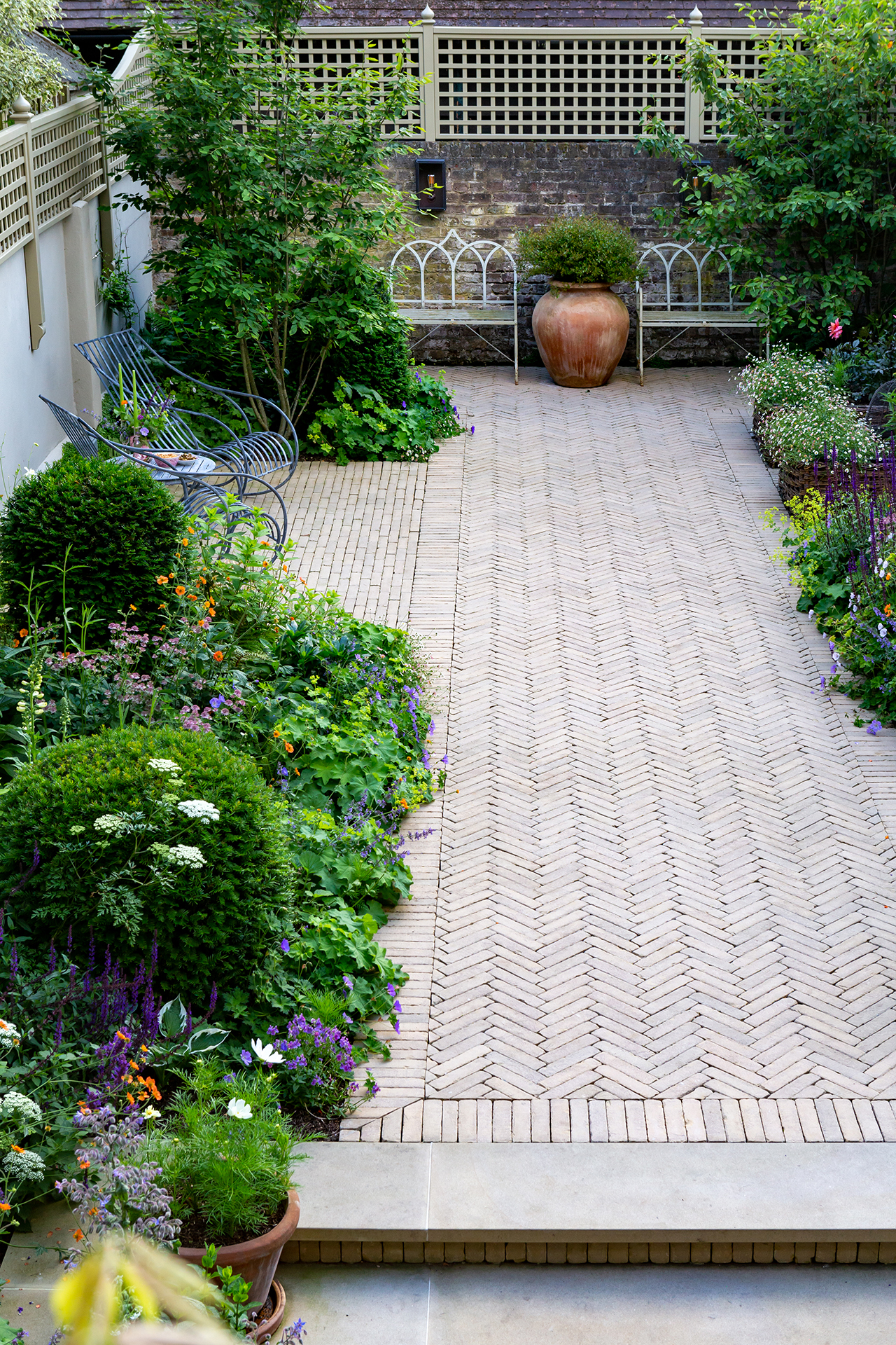 This beautifully designed residential garden in Belsize Park, London, balances functionality, aesthetics, and ecological sustainability. Sitting nearly two metres above the lower ground floor and more than a metre below the raised ground floor of the house, the garden posed a unique design challenge. The project required integrating a lawn for the clients’ young children, a seating area in the sunniest part of the garden, a vegetable bed, ample storage, and lush planting.